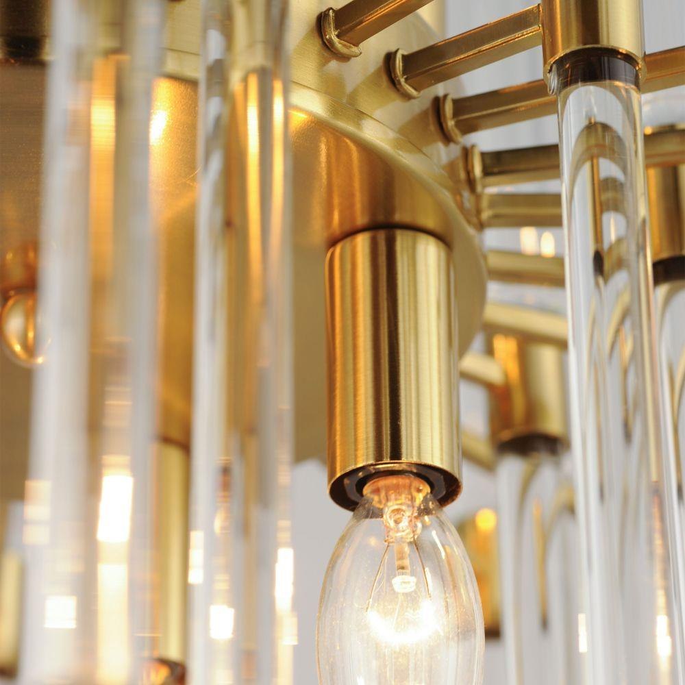 The composition of Clear glass rods are elegantly supported by thin radial arms of staggered lengths to create an iridescent motif that is truly Divine. Finished in Polished Nickel or Heritage Brass, the simplicity of this design delivers a crisp lighting fixture that works in a multitude of interior aesthetics from contemporary to traditional. Available in pendant, chandelier, and wall sconce configurations.