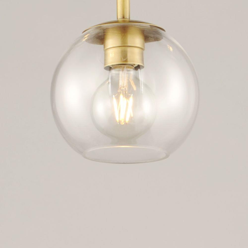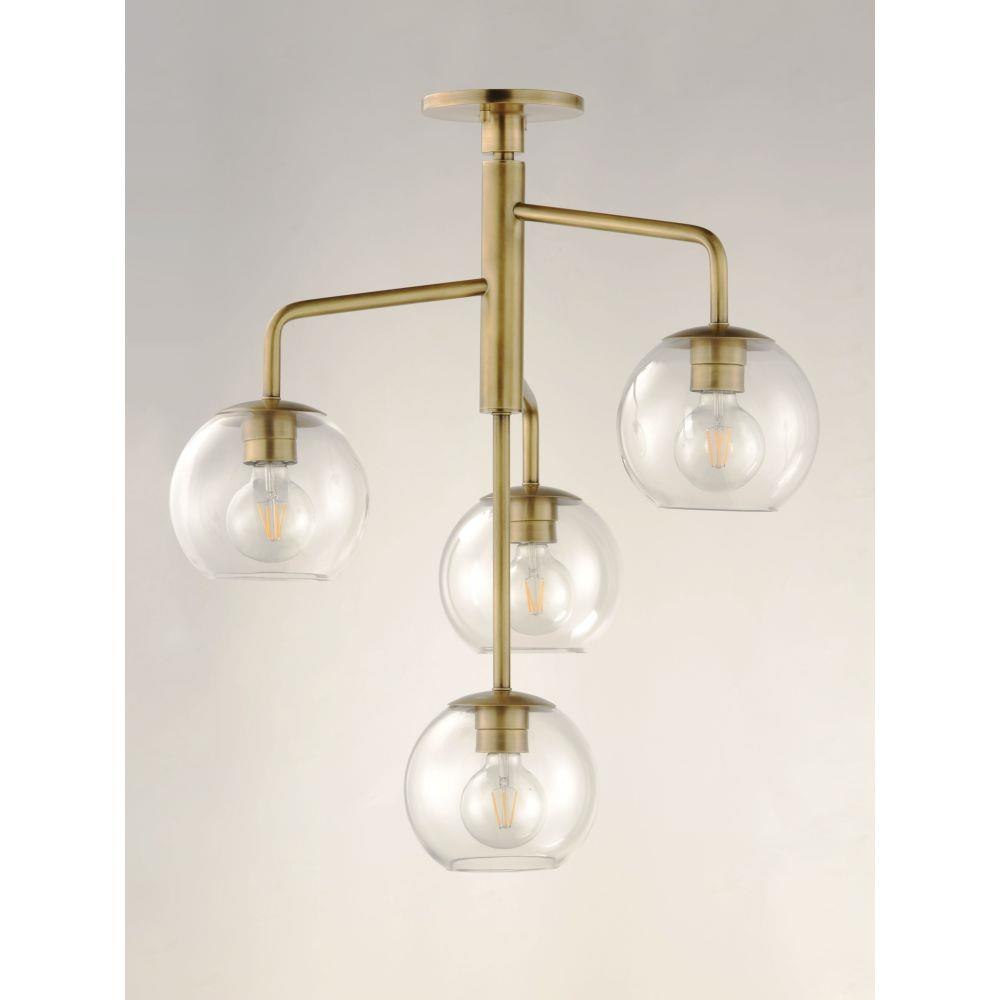 Vessels of heavy weight Clear glass are supported on frames of solid brass finished in a hand rubbed Natural Aged Brass finish. A versatile collection of up and down configurations which can be directly attached to the canopy or extended down by the rods supplied.