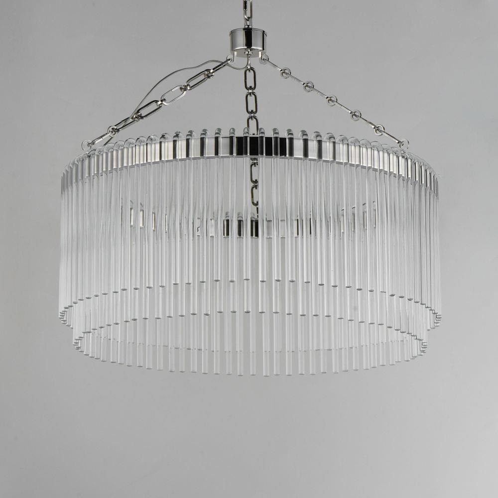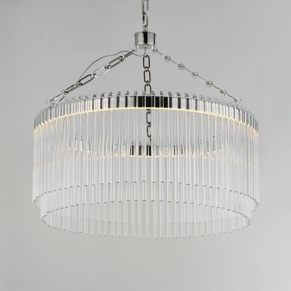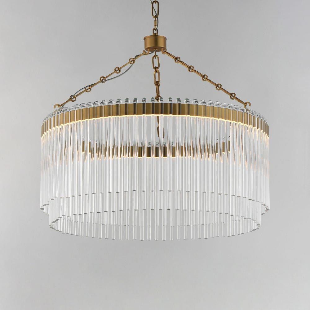 Clear glass rods elegantly curve to drape over a metal frame, encasing an integrated LED light source within. These ornamental glass rods form a luminous curtain, softly illuminated by the LEDs. The LED light source features an adjustable color temperature, allowing you to effortlessly switch between warm 2700K, neutral 3200K, and cool 4000K settings to suit any ambiance. Suspended by intricately designed chain links, the jewel-like glass skirt adds a touch of sophistication and refinement. Choose from two stunning frame finishes: Natural Aged Brass or Polished Nickel.