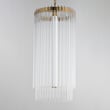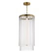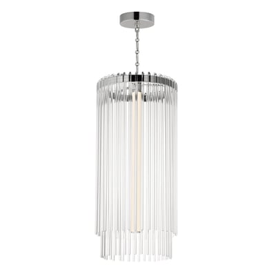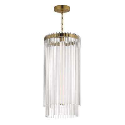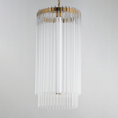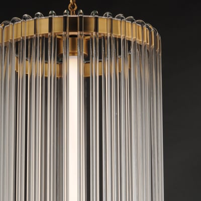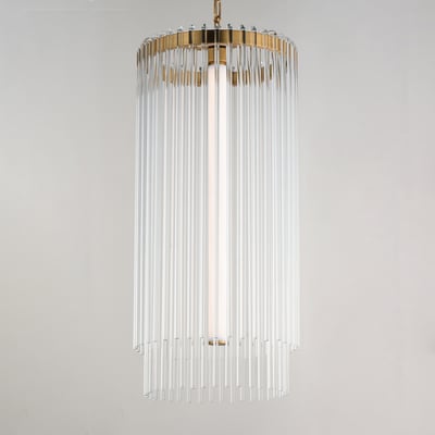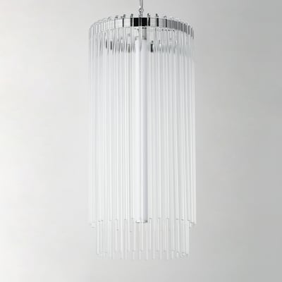 The Jolie Foyer Pendant elevates any entryway with its elegant design and innovative lighting features. Clear glass rods gracefully curve over a sturdy metal frame, creating a luminous curtain that enhances your space with a warm glow.