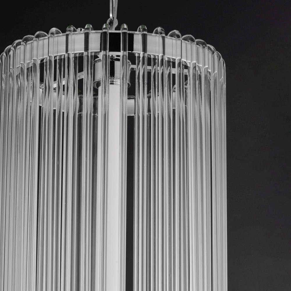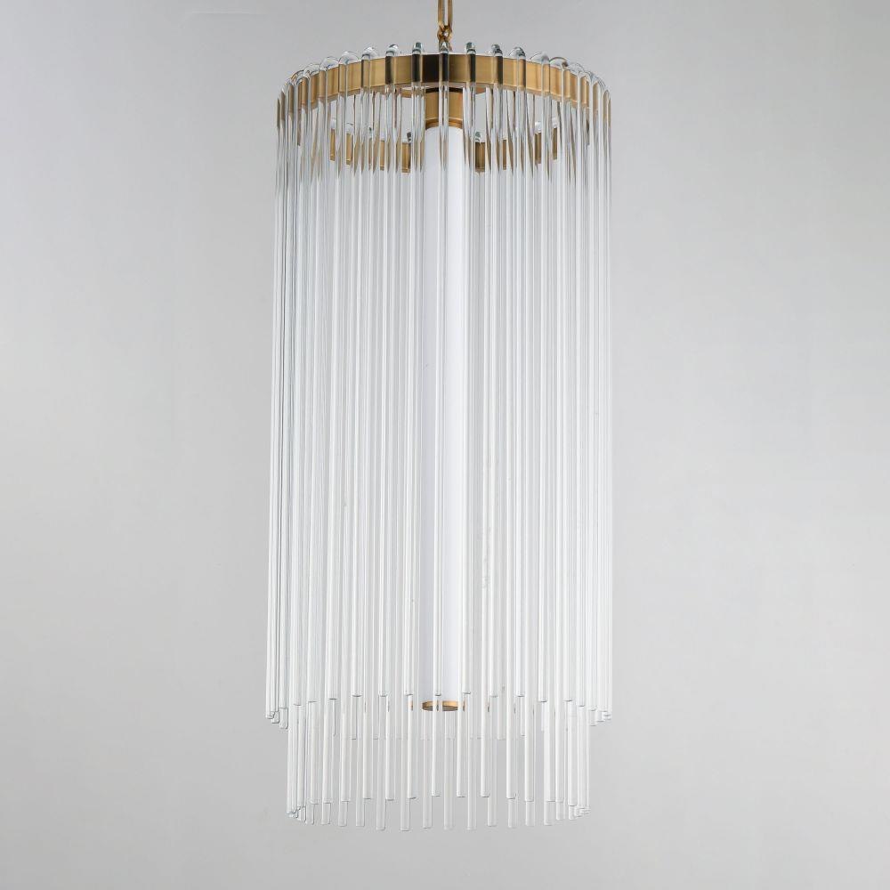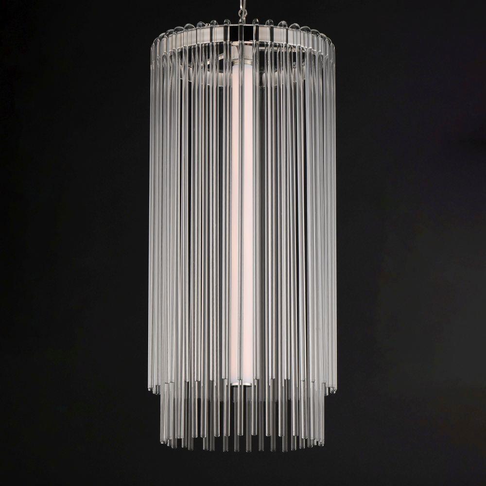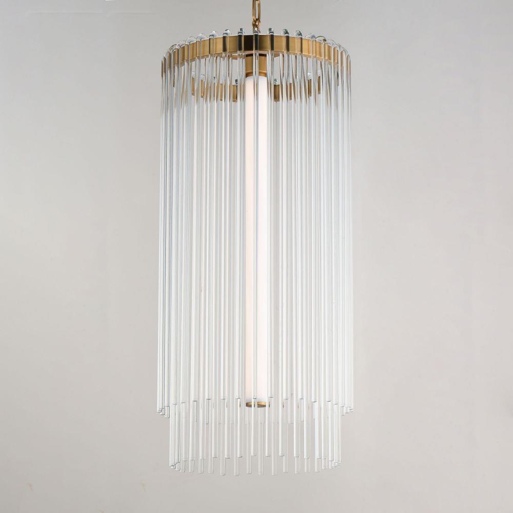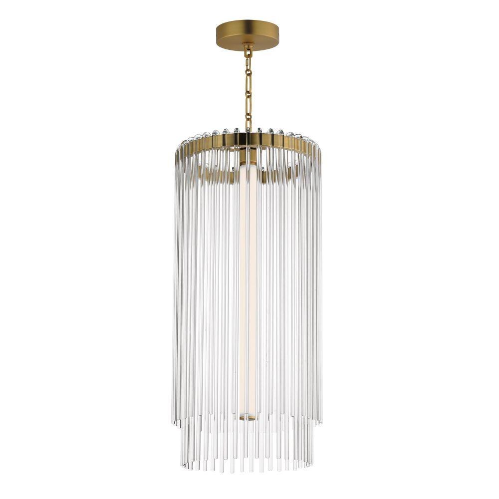 Clear glass rods elegantly curve to drape over a metal frame, encasing an integrated LED light source within. These ornamental glass rods form a luminous curtain, softly illuminated by the LEDs. The LED light source features an adjustable color temperature, allowing you to effortlessly switch between warm 2700K, neutral 3200K, and cool 4000K settings to suit any ambiance. Suspended by intricately designed chain links, the jewel-like glass skirt adds a touch of sophistication and refinement. Choose from two stunning frame finishes: Natural Aged Brass or Polished Nickel.