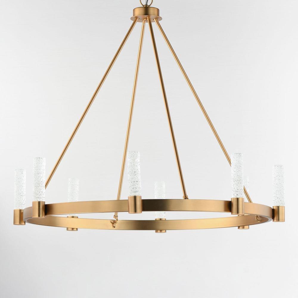 The Duchess collection seamlessly blends traditional brass craftsmanship with modern piastra-style Iceberg glass, illuminated by integrated LED modules. Powered by a commercially rated LED driver with 120-277V input, the low-voltage LEDs deliver a neutral 3000K color temperature. The rectangular tubing frame in Natural Aged Brass softens the contemporary aesthetic, while decorative flat-edge chain links add a touch of elegance. A dual-mount canopy offers flexibility for shorter height profiles or field-adjustable lengths with the included chain.