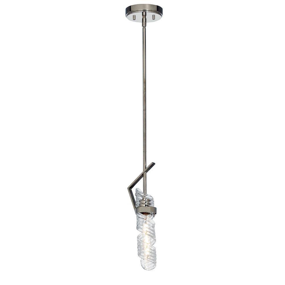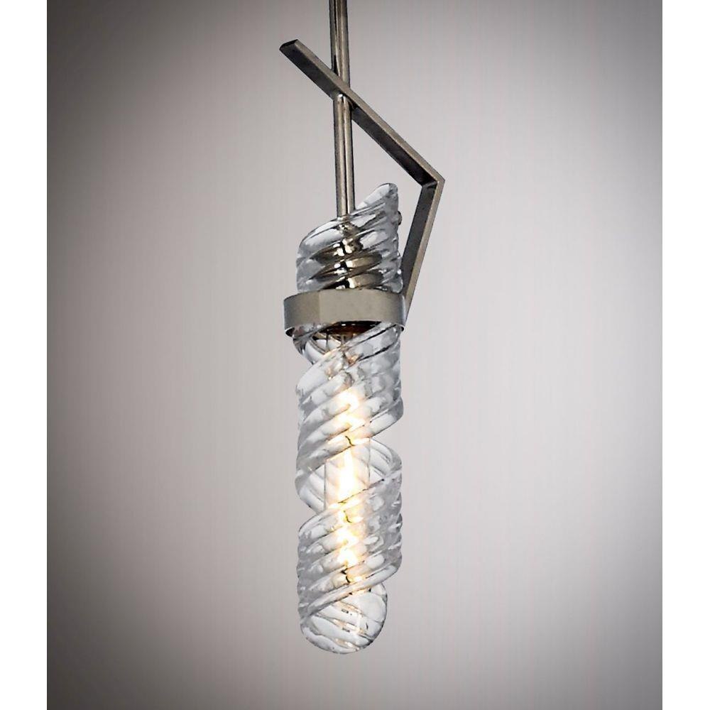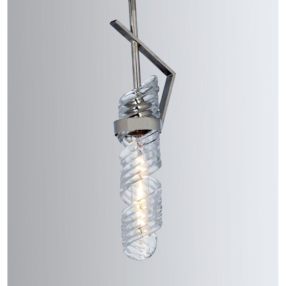 The highlight of this collection is the hand formed Clear spiral glass shades which are nested in a unique frame of Polished Nickel. Inspired by the
