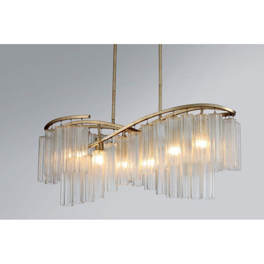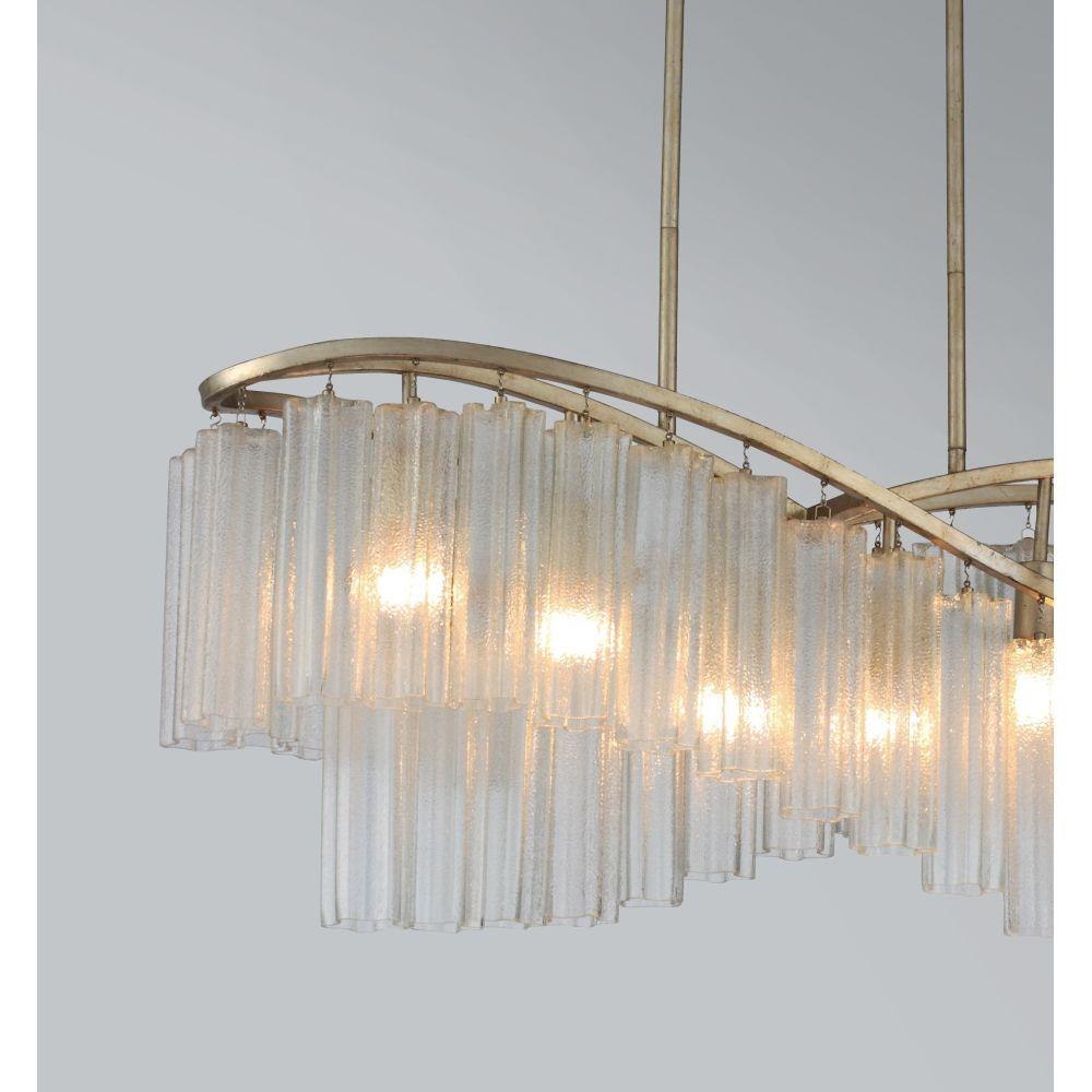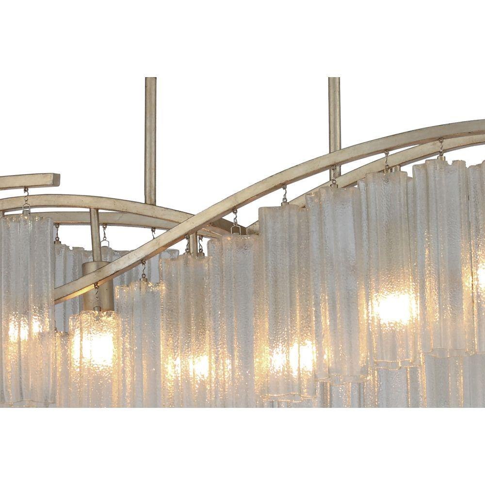 Cascading Waterfall glass shades are suspended from a frame finished in our popular Golden Silver. This elegant collection spans design genres from contemporary to traditional which gives it universal appeal.