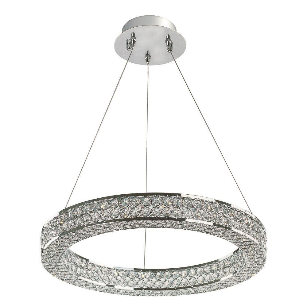 Frames of metal rings encased with Beveled Crystal Jewels, are finished in Polished Chrome. Suspended by cables as if floating In air, these rings cast rainbows of light when illuminated by the Integrated LED.