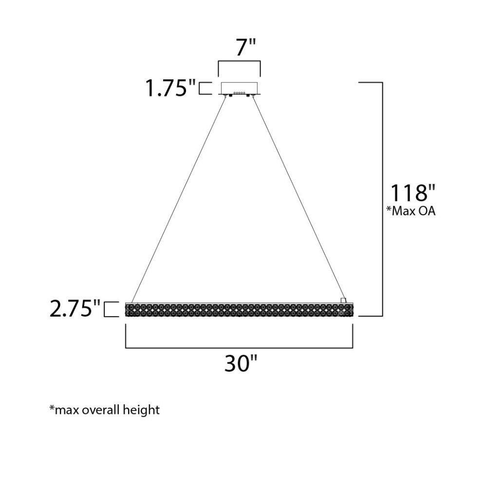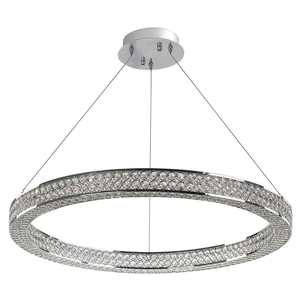 Frames of metal rings encased with Beveled Crystal Jewels, are finished in Polished Chrome. Suspended by cables as if floating In air, these rings cast rainbows of light when illuminated by the Integrated LED.