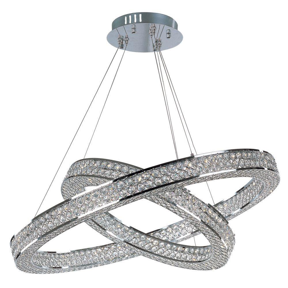 Frames of metal rings encased with Beveled Crystal Jewels, are finished in Polished Chrome. Suspended by cables as if floating In air, these rings cast rainbows of light when illuminated by the Integrated LED.