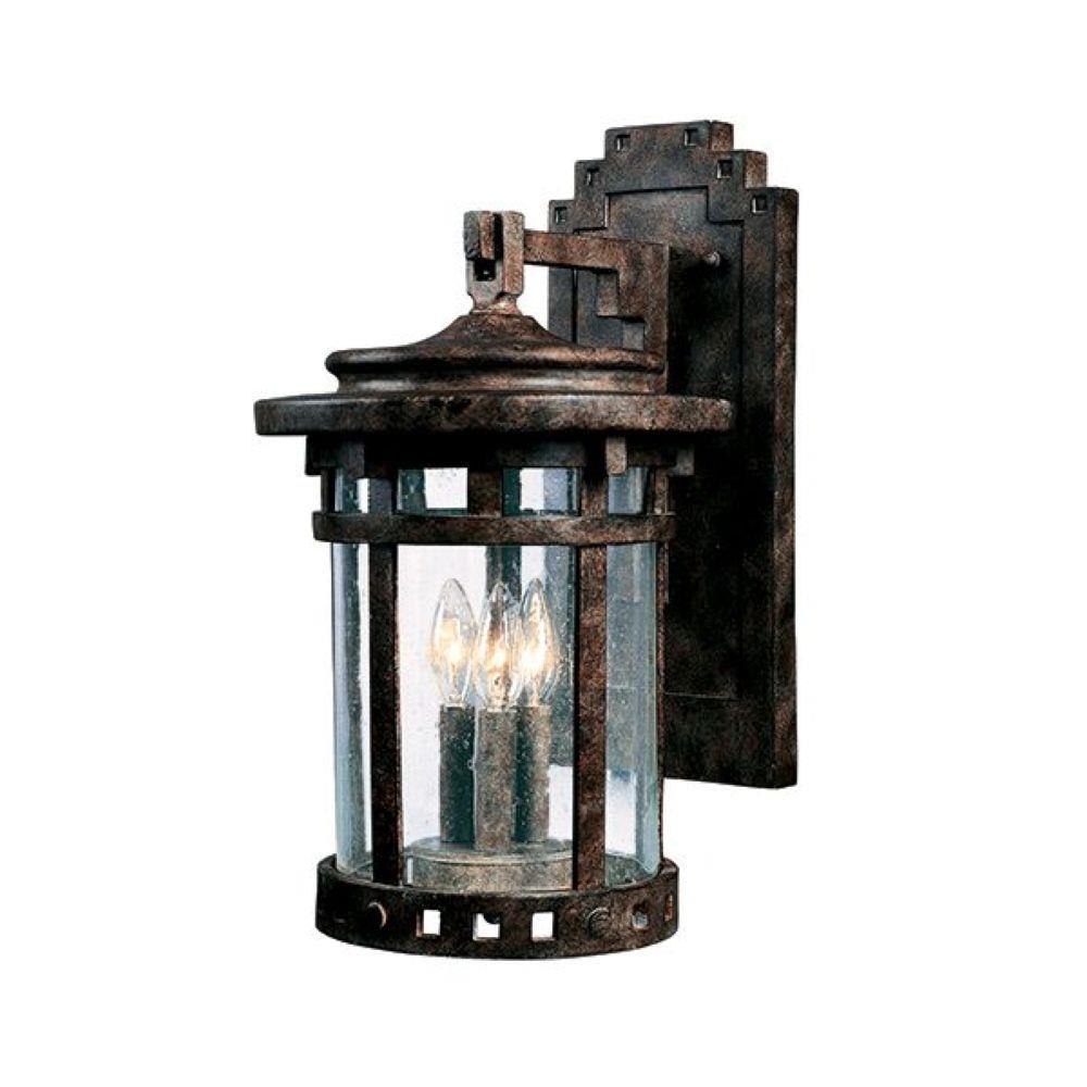 Very Rugged and durable outdoor lantern...Maxim set out to make an extremely durable outdoor light and their engineers created a man-made material that is twice (2-times) as weather-resistant as conventional outdoor lantern material be it steel, resin or aluminum. The material is called Vivex and it will withstand temperatures up to 130-degrees or minus 20-degrees. And Maxim made the lantern even more durable by finishing it in a tough Sienna Bronze. Glass is Clear Seedy glass for a nice bright look. Generally classified as Round California Americana the outdoor lantern is both very attractive to the eye and extremely weather durable. 16" overall height, 9" overall wide, 11" wall extension and 3x60-watts candelabra for great brightness. Backplate is 14"h x 6"w and center to top mounting point is 3.5". Wet Location RatedVivex is a unique new compound material specifically designed for use outdoors. It is composed of ground marble for strength and latex for durability. Vivex has been tested up to 130ºF and as low as -20ºF, so extreme weather conditions will no longer warp or damage your outdoor lighting fixtures. Vivex is flame retardant, non-corrosive, and UV resistant so it will not fade over time. Vivex is backed by a 3-year limited warranty by Maxim Lighting. Bold and beautiful, the Santa Barbara Collection lights the outdoors with assertive flair. Rich, saturated colors add to the distinctive masculine quality of this unmistakably mission-style fixture. A sturdy column of cool, seedy glass encases a solid pedestal showcasing candles that cast clear warm light through ample windows. Strong vertical lines connect with their horizontal counterparts to create the signature dentil pattern. The chocolaty sienna finish makes a statement all its own with an aesthetic range of hues from deep chestnut to copper highlights. As strong inside as it is out, Santa Barbara is made of Vivex, a material twice the strength of resin. Maxim—the smart choice for beautiful, durable outdoor lighting.
