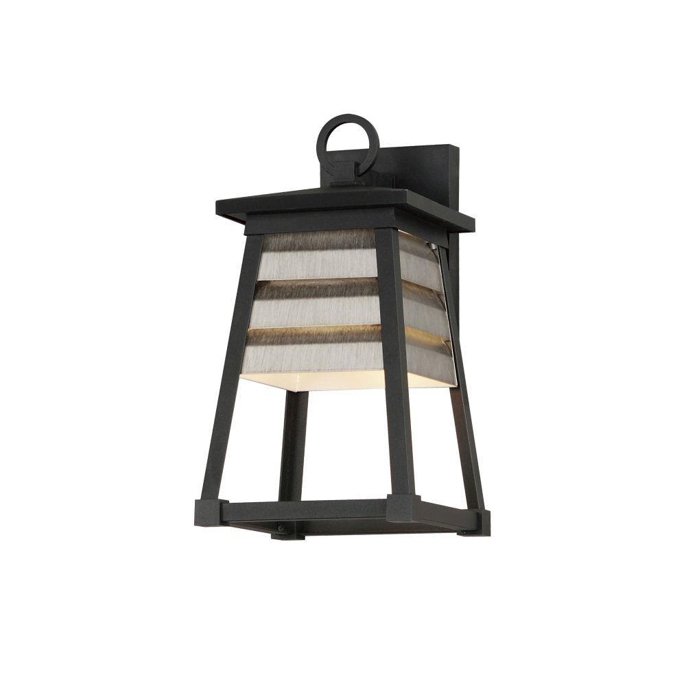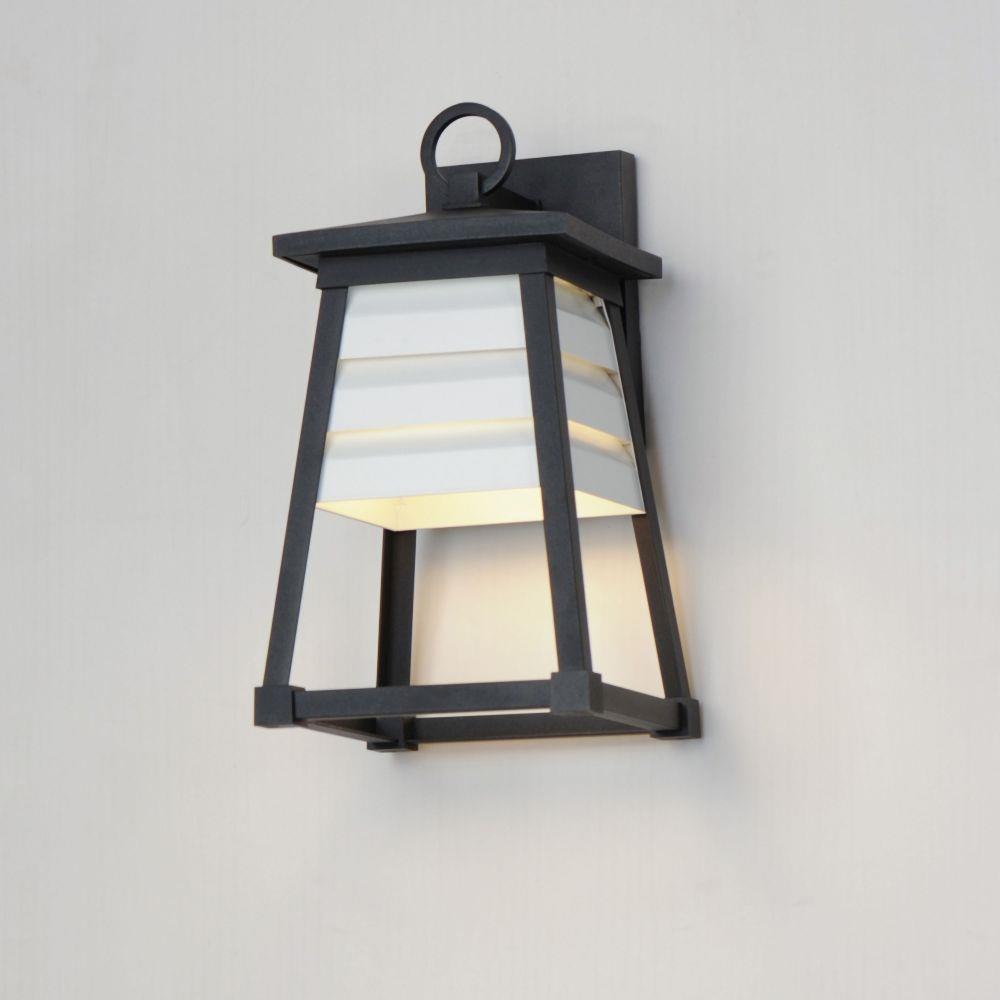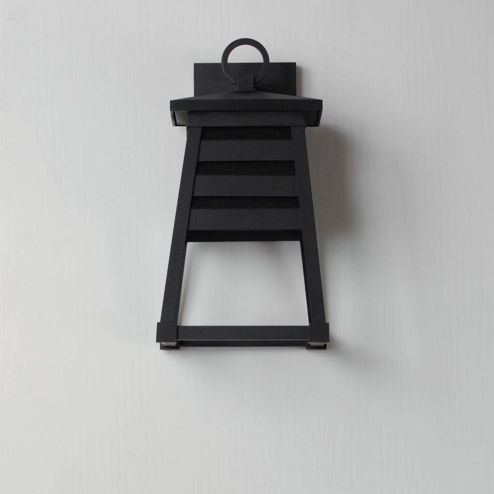 Contrasting louvered insets are set within Matte Black trapezoidal frames. The frames are made of Vivex so their finish will withstand harsher climates. The louvered panel insets are made of aluminum and feature a full cut-off design aesthetic making this design suitable for Dark Sky applications. An added benefit is the removal of glass altogether, adding a robust quality to the construction of the fixtures leading to longevity and lower maintenance. These wide plank louver panels complement the design's coastal styling adding interest in contrasting Weathered Zinc or White options, while the matte Black finish blends into the frame for a cleaner, more seamless approach.
