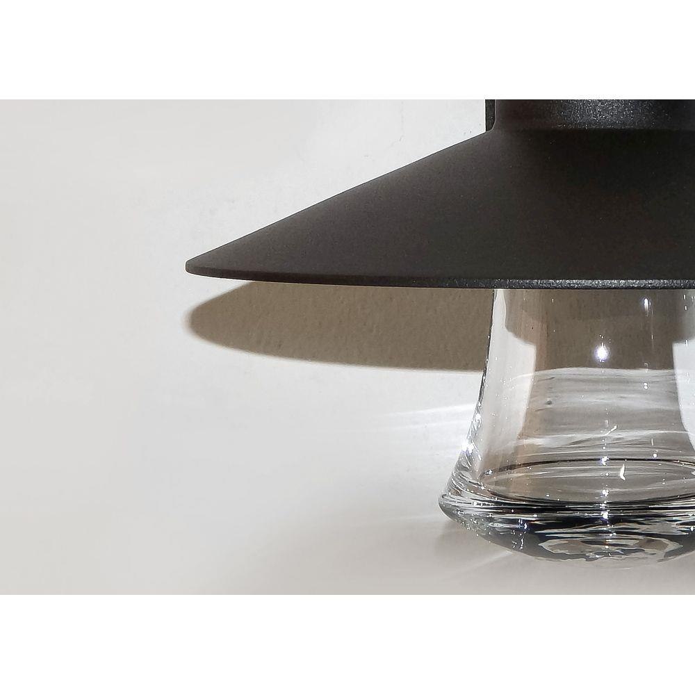 Conical shades finished in Architectural Bronze appear to be suspended by its stainless steel cable. Concealed inside these shades is a high powered COB LED which shines into a heavy Clear glass font. The bottom of theses fonts have an additional thickness of glass for better light distribution and lighting effect.