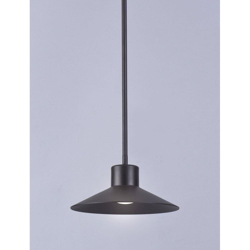 Conical shades finished in Architectural Bronze appear to be suspended by its stainless steel cable. Concealed inside these shades is a high powered COB LED which shines into a heavy Clear glass font. The bottom of theses fonts have an additional thickness of glass for better light distribution and lighting effect.