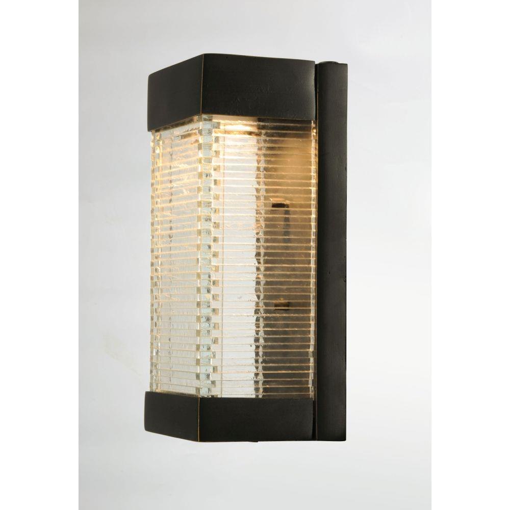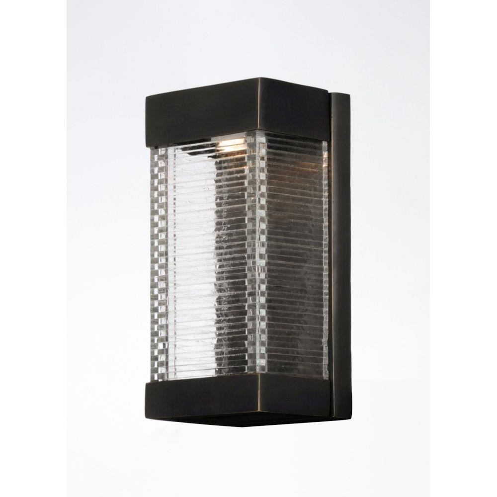 Layers of Clear panels of glass are stacked and fused to create an unusual outdoor design. Integrated LED mounted on the inner Bronze finished hood shed light down the sides of the glass creating an interesting lighting effect.
