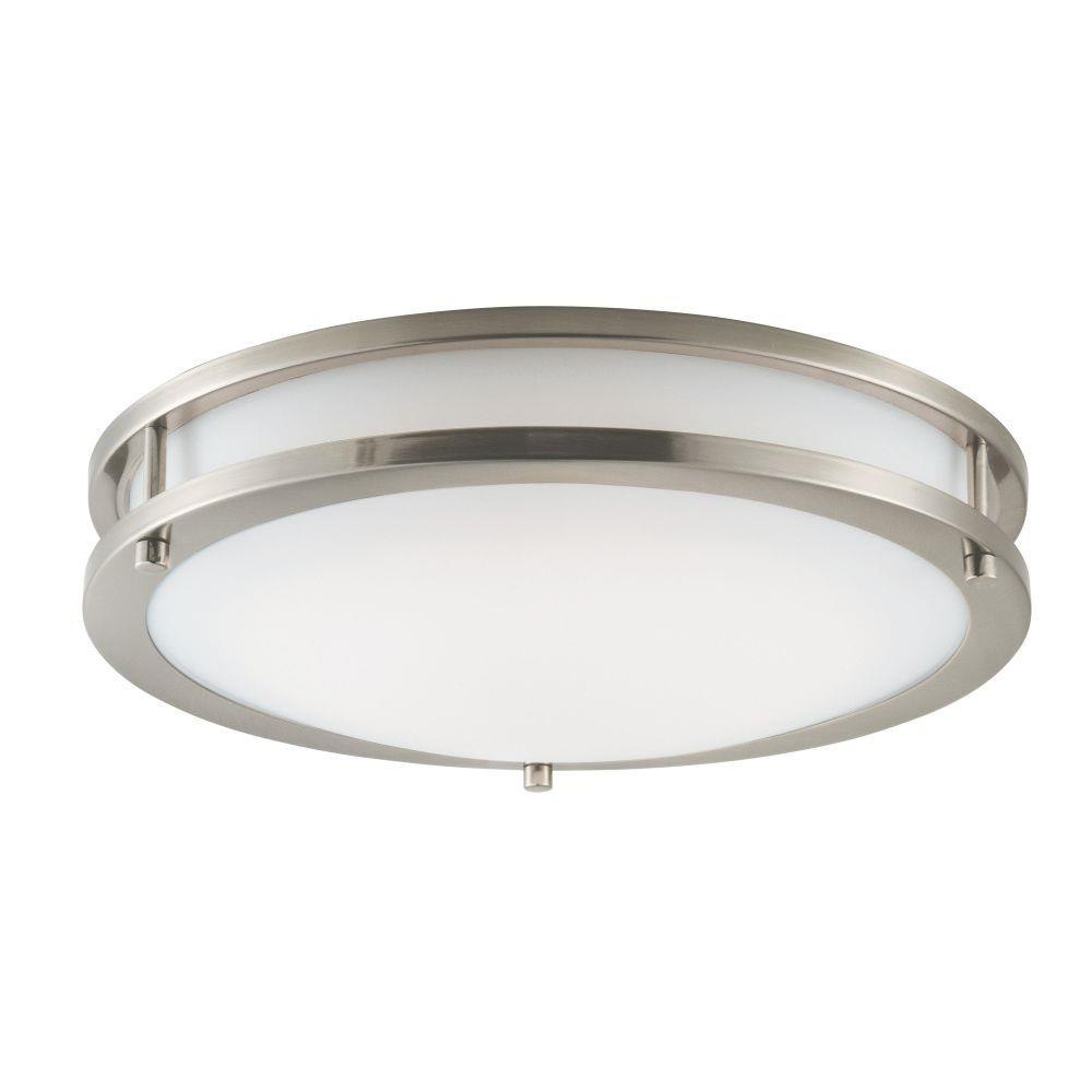 Commercial grade energy efficient lighting featuring linear frames of metal finished in Satin Nickel diffused by an etched opal acrylic creating an updated energy efficient classic.