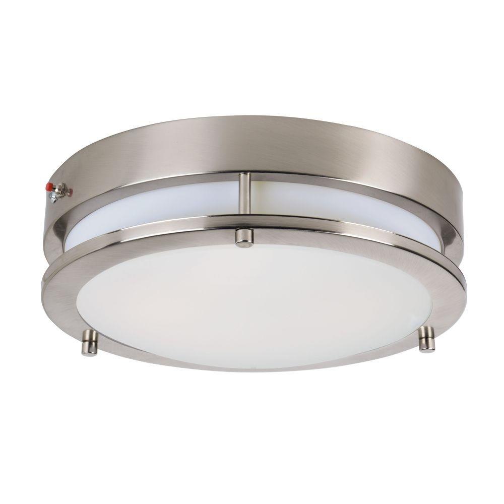 Commercial grade energy efficient lighting featuring linear frames of metal finished in Satin Nickel diffused by an etched opal acrylic creating an updated energy efficient classic.