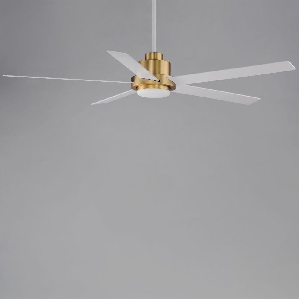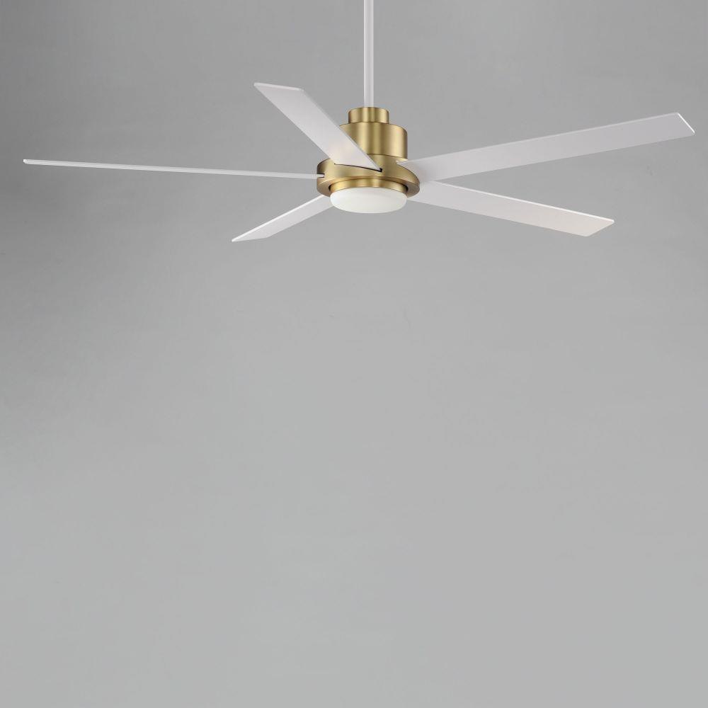 For larger spaces, a larger blade span is sometimes required. This minimalist design is pure and simple. Elongated ABS blades span 60 inches and finished in Matte White contrasting the motor housing's Natural Aged Brass finish. The two tone finish makes for a stylish and bright fan great for interior spaces. Wall control with dual slide dimmer and fan speed control is provided.