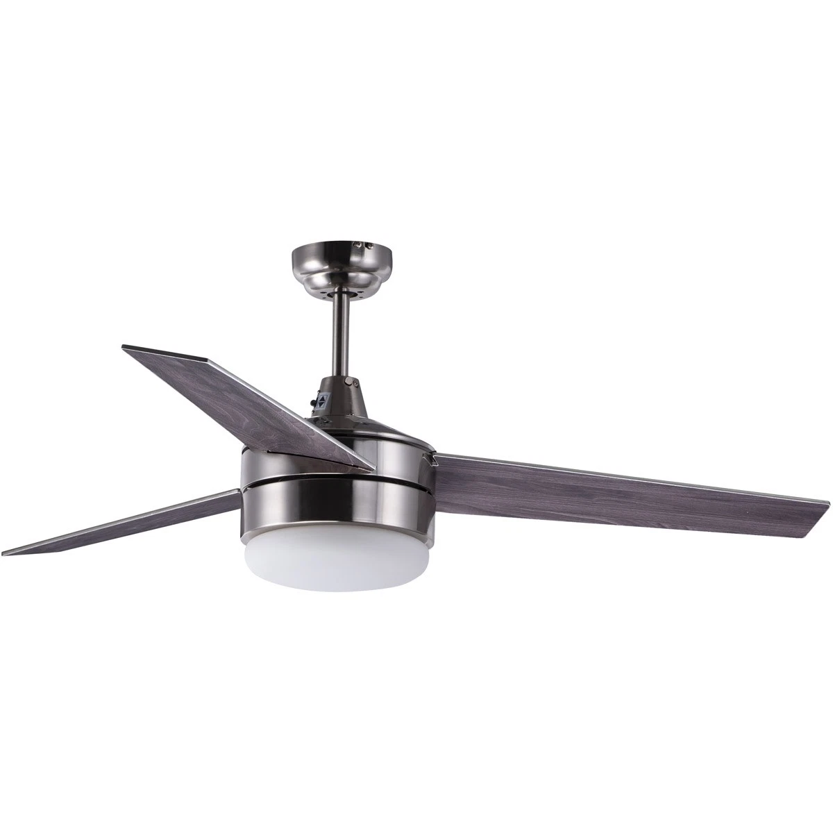 A contemporary, yet transitional look at economical pricing, the Trio fan is finished in Satin Nickel with 3 straight fan blades in Black on one side and silver on the other side. The fan is powered by a wall control included as well as LED JA8 compliant bulbs also included.