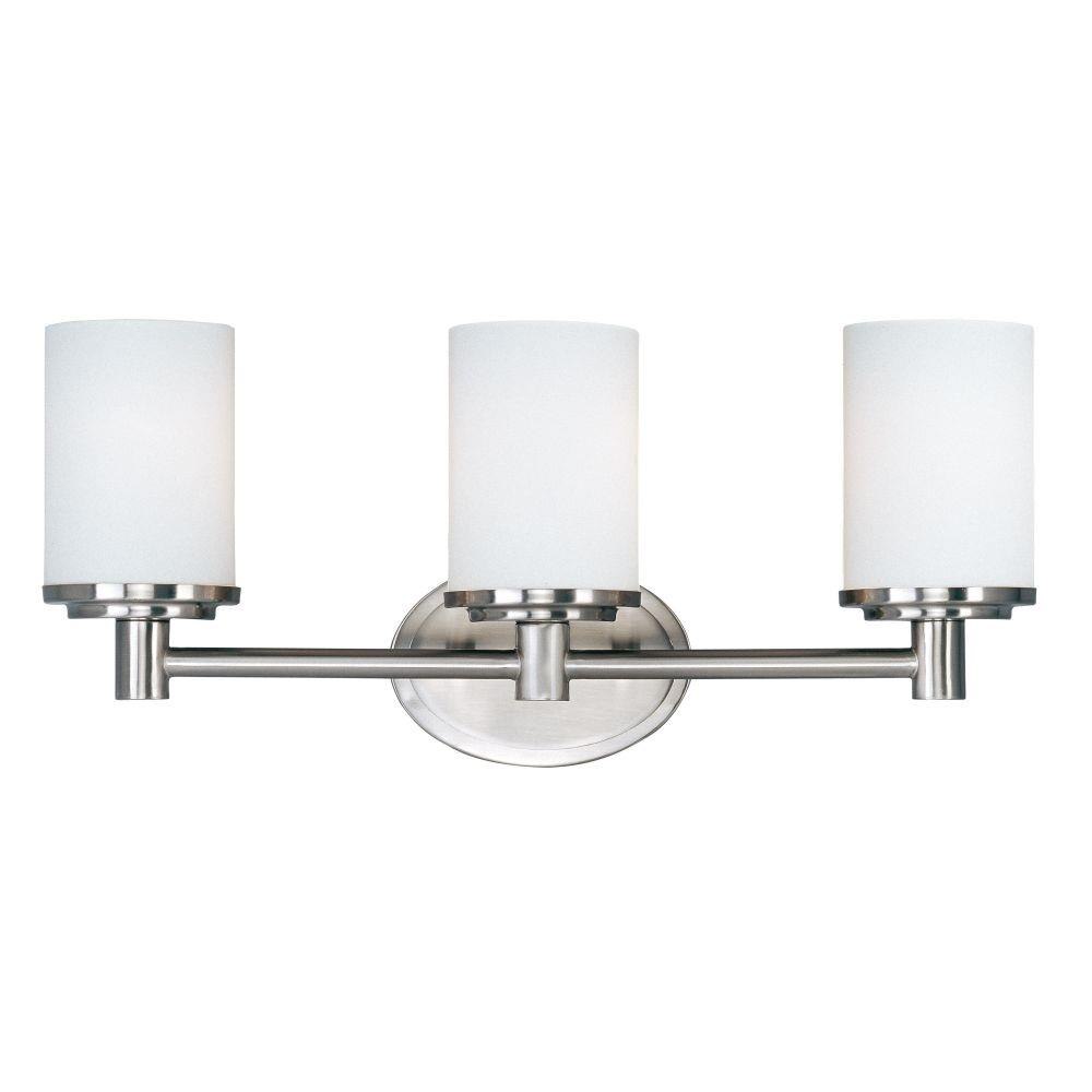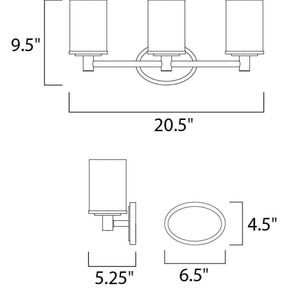 Product Features: Part of the Cylinder Collection Fully covered under Maxim's 1-year limited warranty Dimmable fixture - designed to work with most standard dimmer switches Reversible Mounting - May be installed with the glass pointed upward or downwards UL Listed for Damp Location Product Specifications: Height: 9.5" (measured from top to bottom most point of fixture) Width: 20.5" (measured from furthest point left to furthest point right on fixture) Extension: 5.25" (measured from mounting surface to furthest protruding point on fixture) Bulb Base: Medium (E26) Bulb Type: Incandescent Number of Bulbs: 3 Bulb Included: No Watts Per Bulb: 100 Wattage: 300 Voltage: 120 Product Variations: 9051: 1 Light 9.5" Tall Bathroom Sconce 9052: 2 Light 12.5" Wide Vanity 9054: 4 Light 29" Wide Vanity