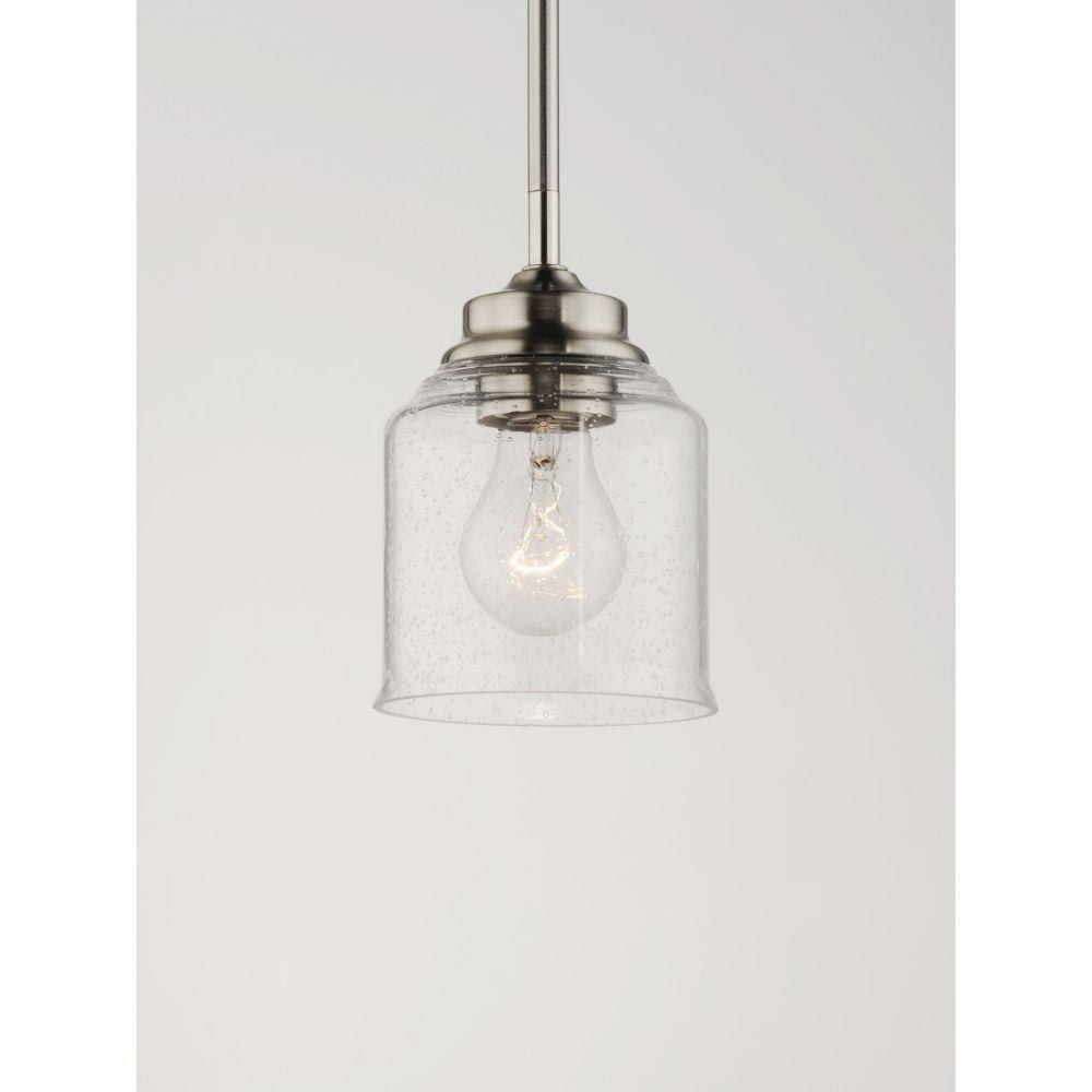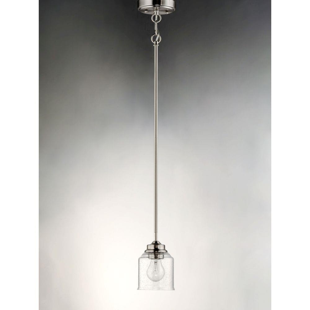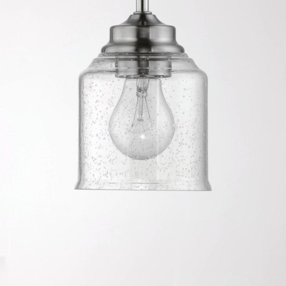 A clean and simple frame features arms that gently bend to support a Clear Seedy glass in a traditional bell shape. An easy choice for a transitional look, available in matte Black or Satin Nickel.
