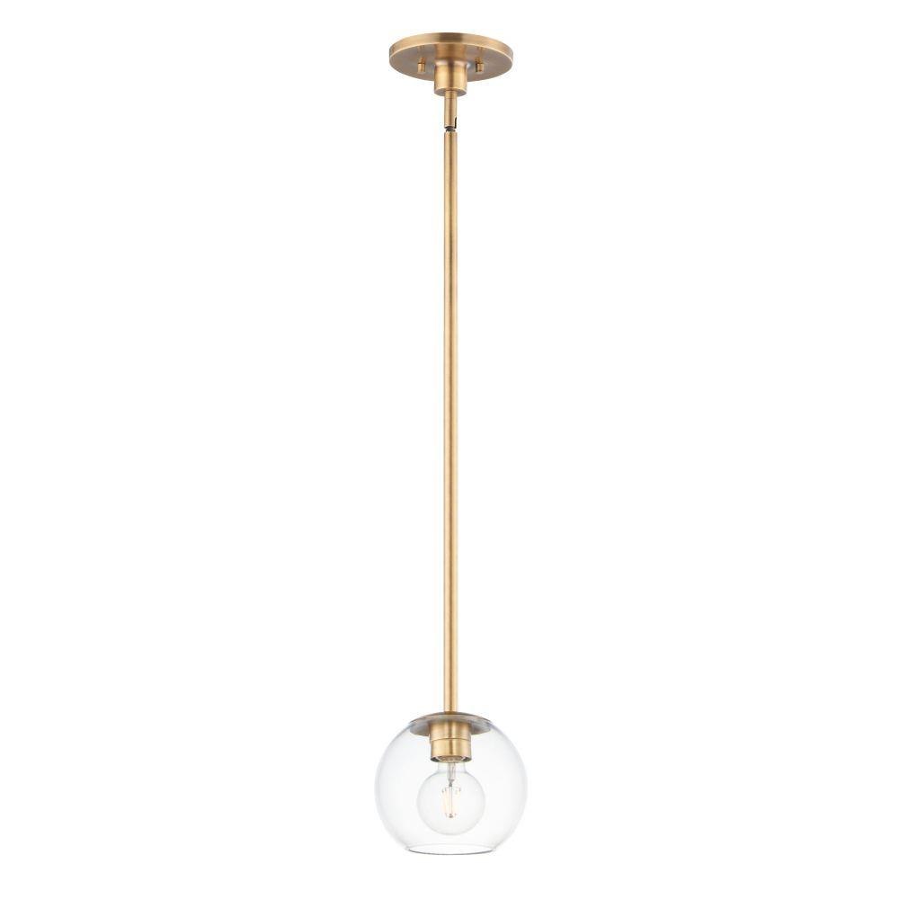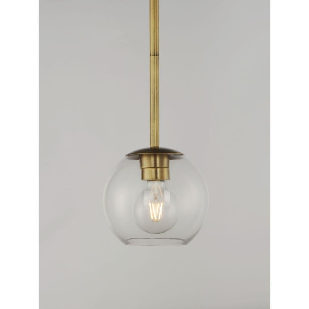 Vessels of heavy weight Clear glass are supported on frames of solid brass finished in a hand rubbed Natural Aged Brass finish. A versatile collection of up and down configurations which can be directly attached to the canopy or extended down by the rods supplied.