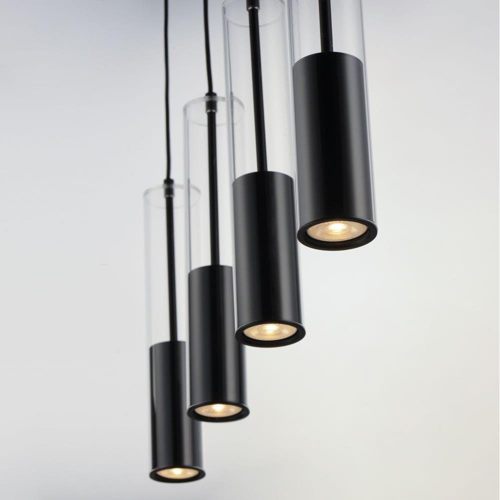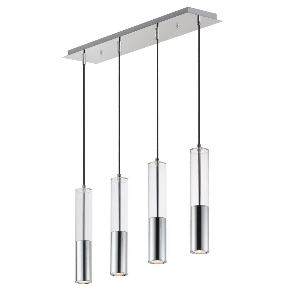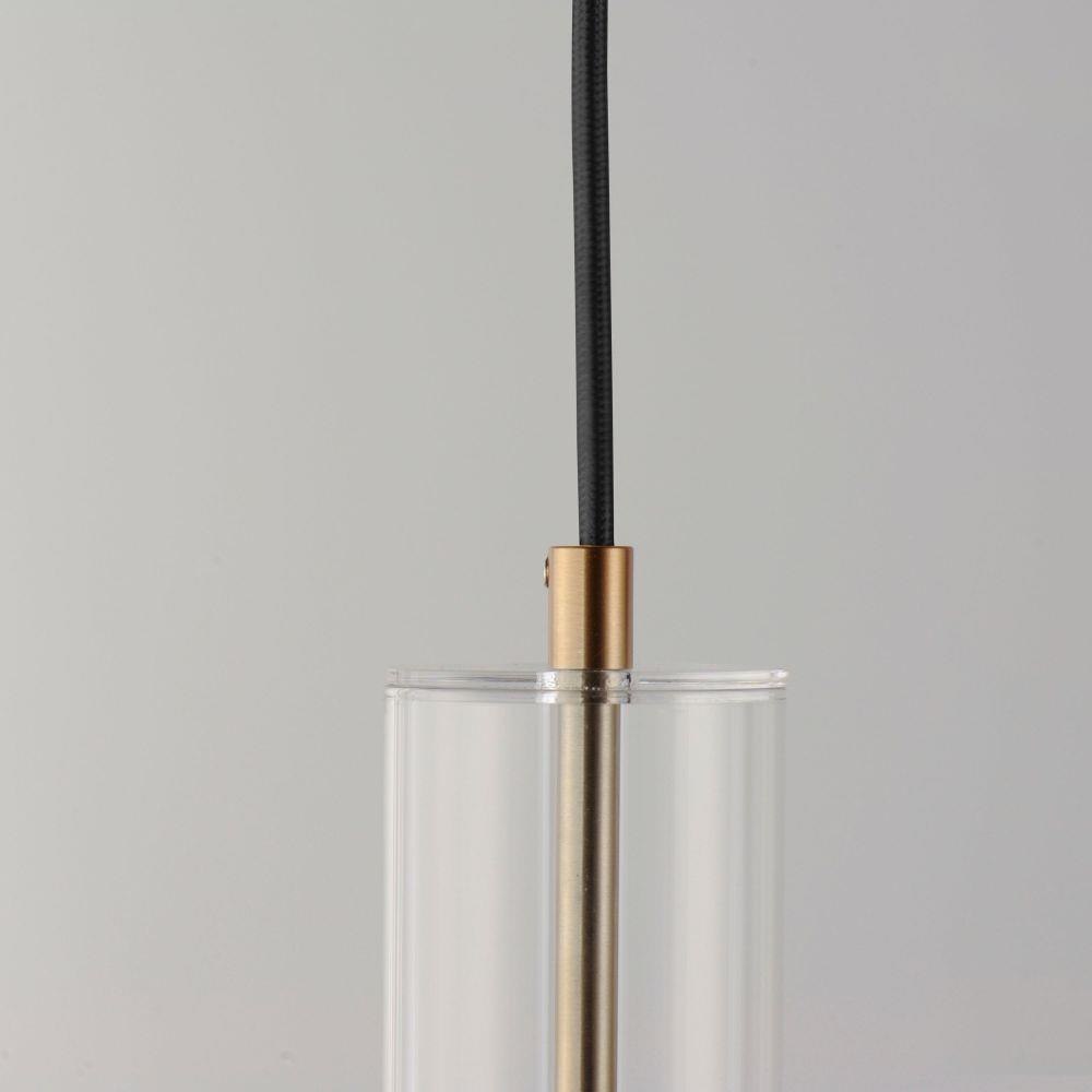 Machined Aluminum tubes of Black, Polished Chrome, or Brass suspend within clear glass overlays. An LED GU10 bulb is recessed within the metal tube providing great directional lighting. Available as a single pendant or as a 4-Light linear pendant and compatible with the 120V canopy kits sold separately.