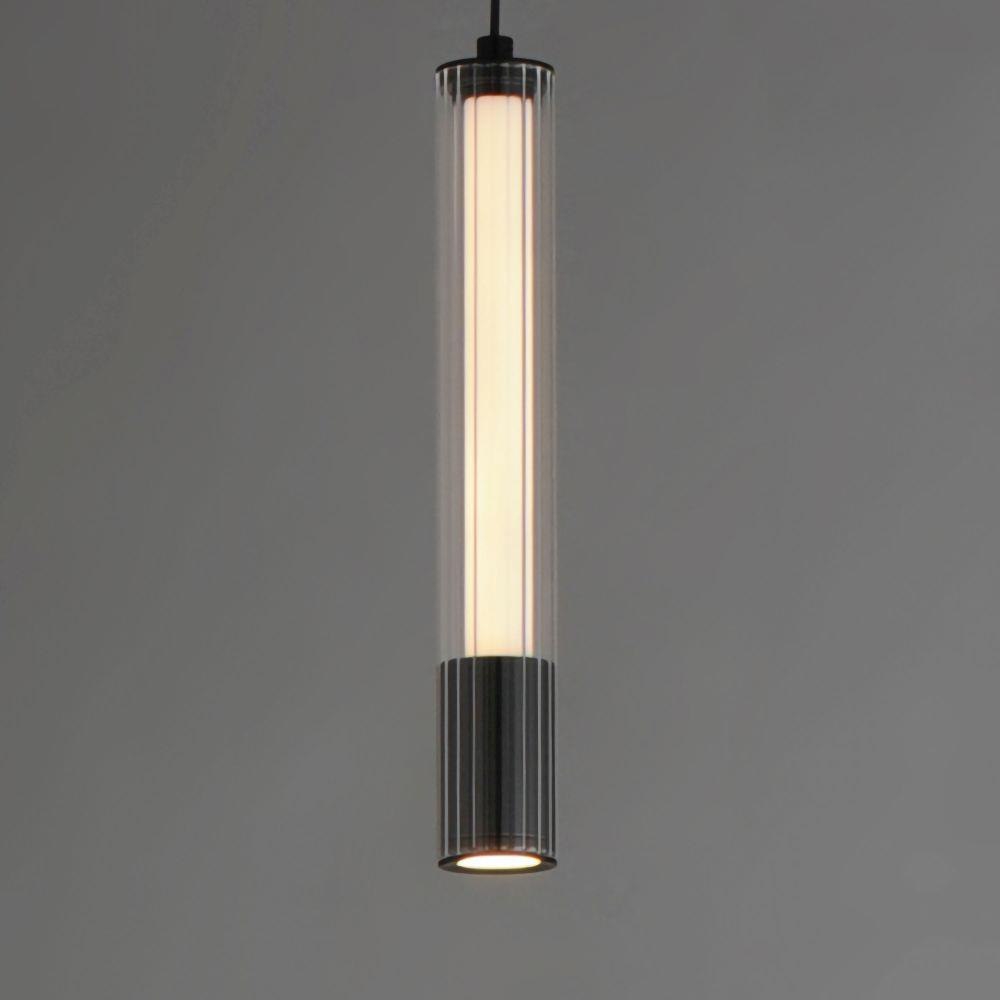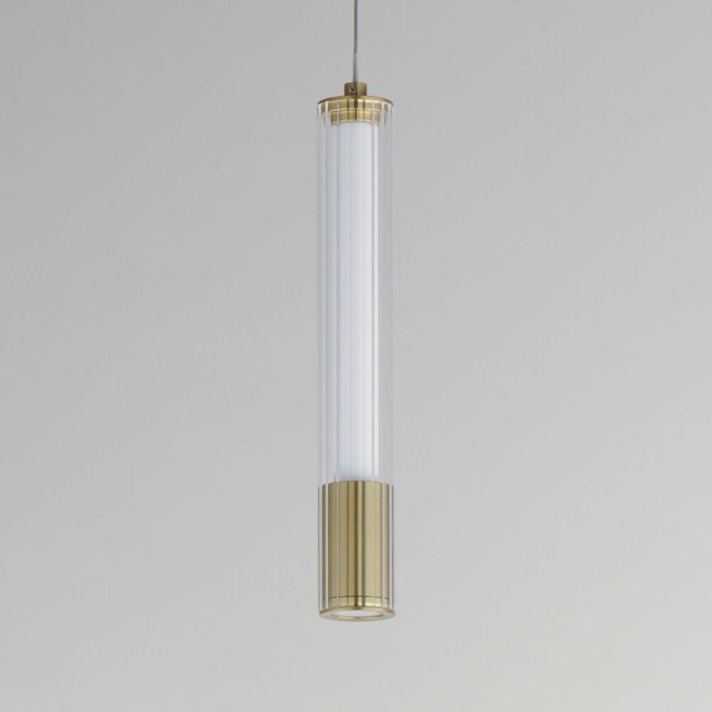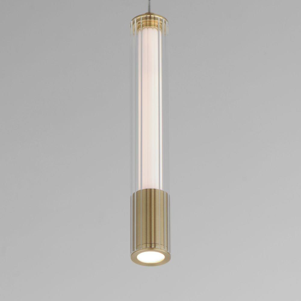 A central, cylinder diffuser of opal white acrylic diffuses LED lighting within a cavity of thin ribbed glass of various lengths. Both imaginative and functional, the bright pendants encase an additional down light recessed within a Naturally Aged Brass or Matte Black housing casting light downward.