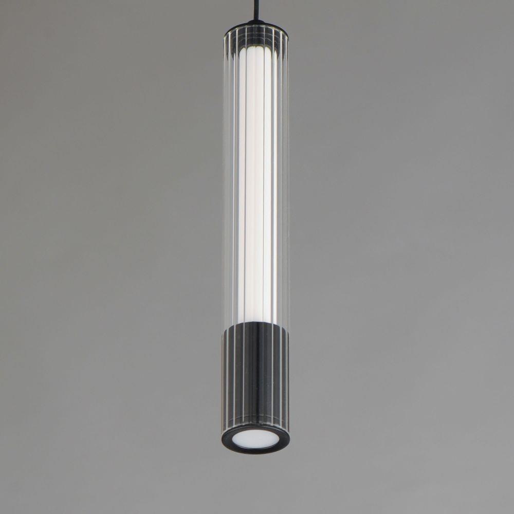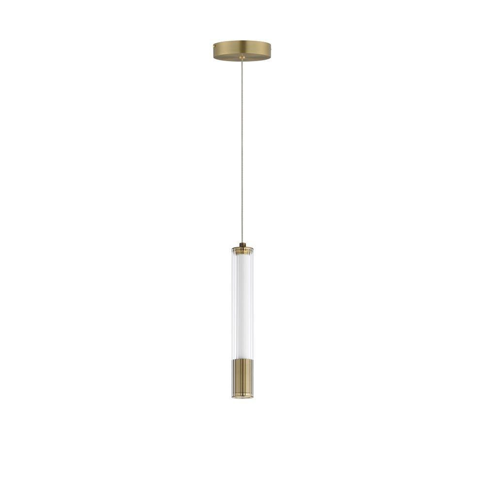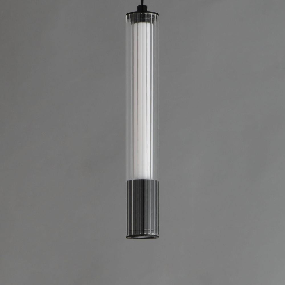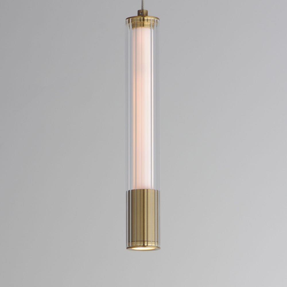 A central, cylinder diffuser of opal white acrylic diffuses LED lighting within a cavity of thin ribbed glass of various lengths. Both imaginative and functional, the bright pendants encase an additional down light recessed within a Naturally Aged Brass or Matte Black housing casting light downward.