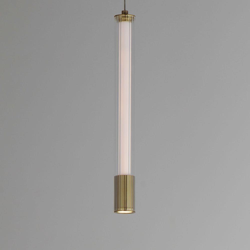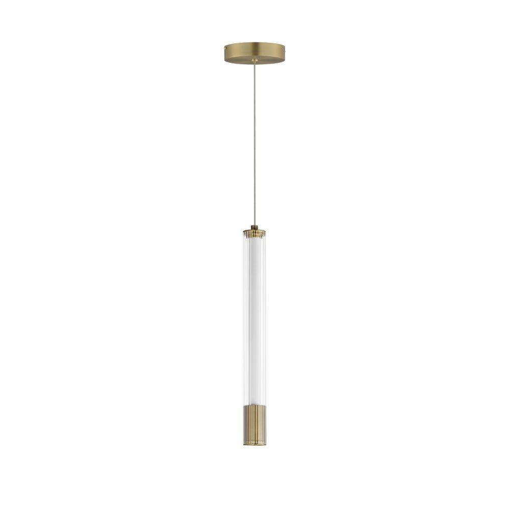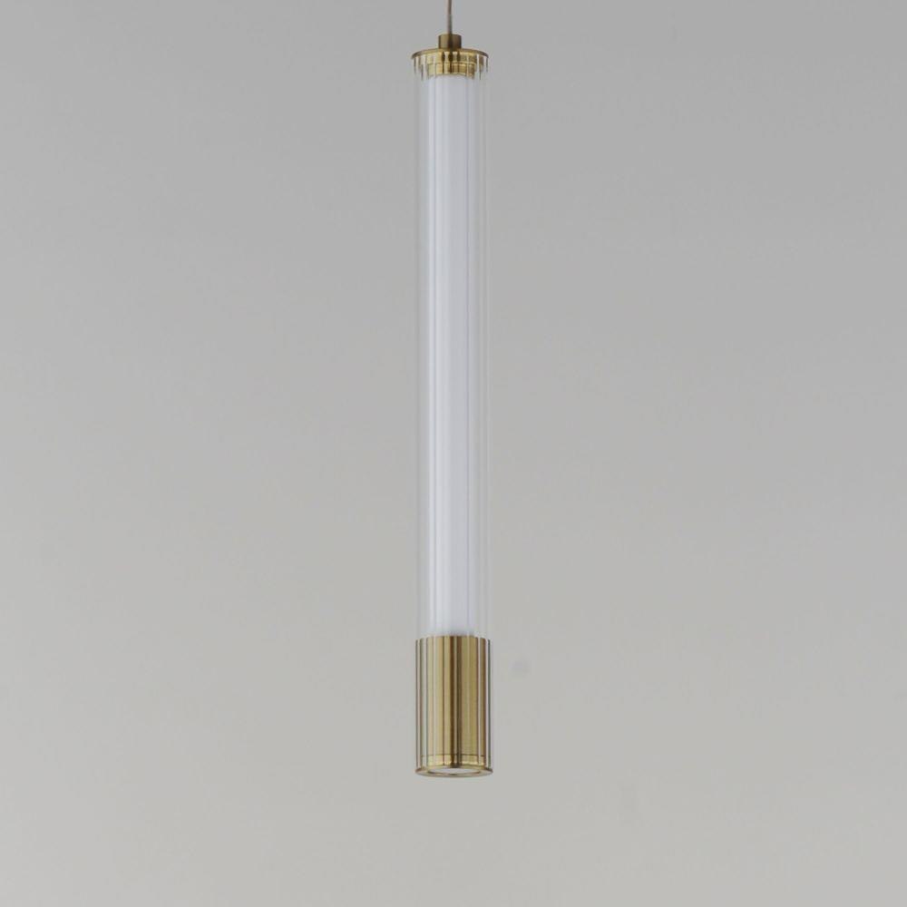 A central, cylinder diffuser of opal white acrylic diffuses LED lighting within a cavity of thin ribbed glass of various lengths. Both imaginative and functional, the bright pendants encase an additional down light recessed within a Naturally Aged Brass or Matte Black housing casting light downward.