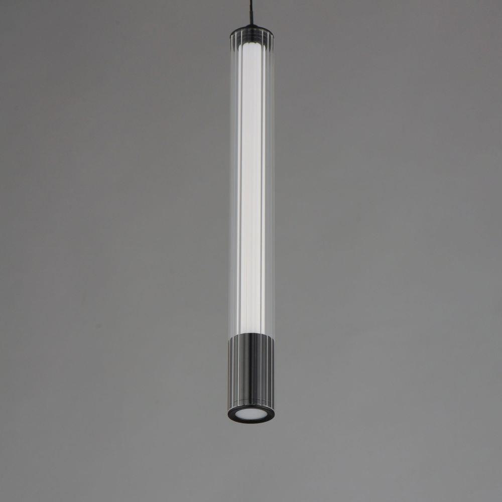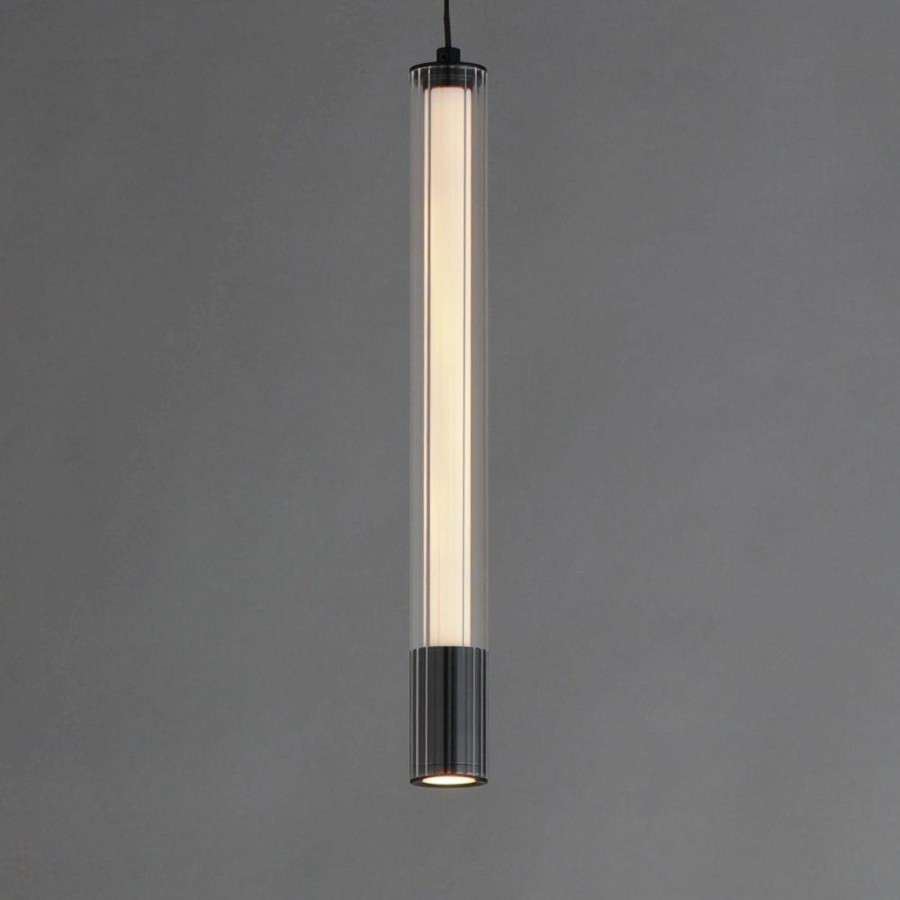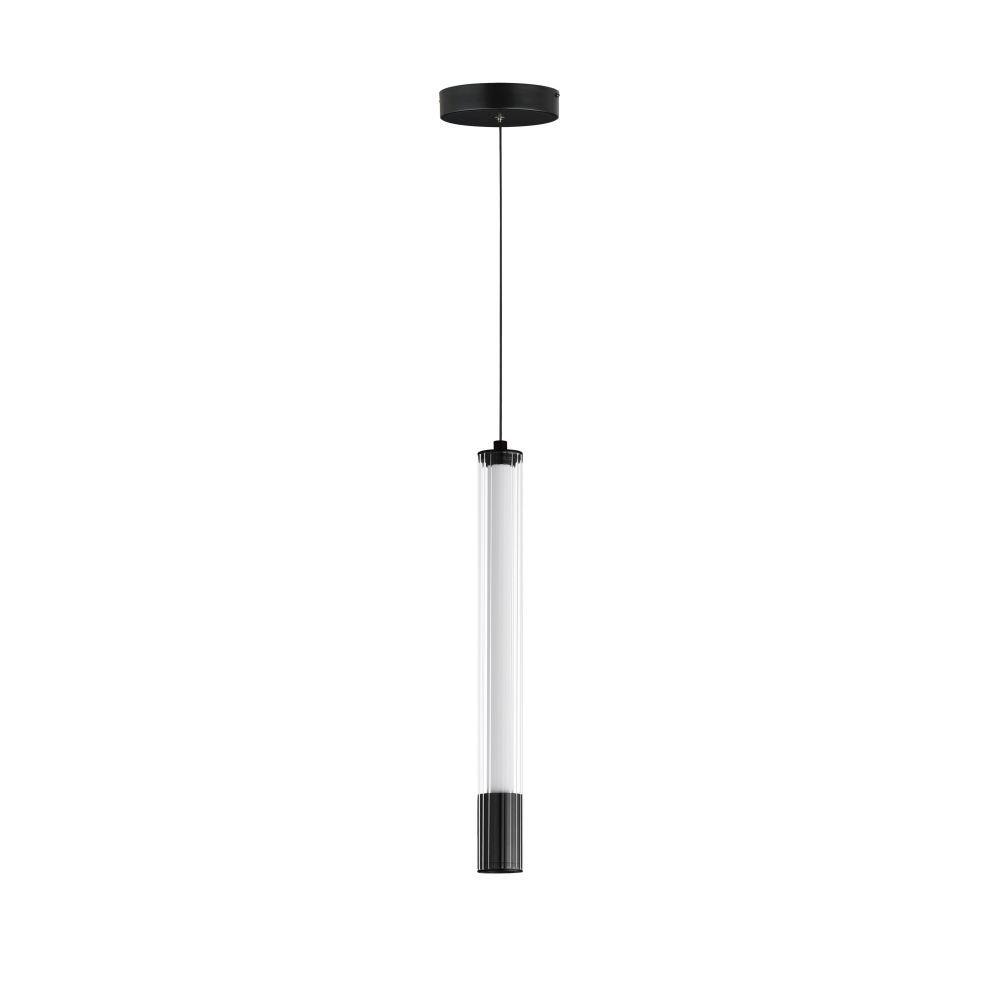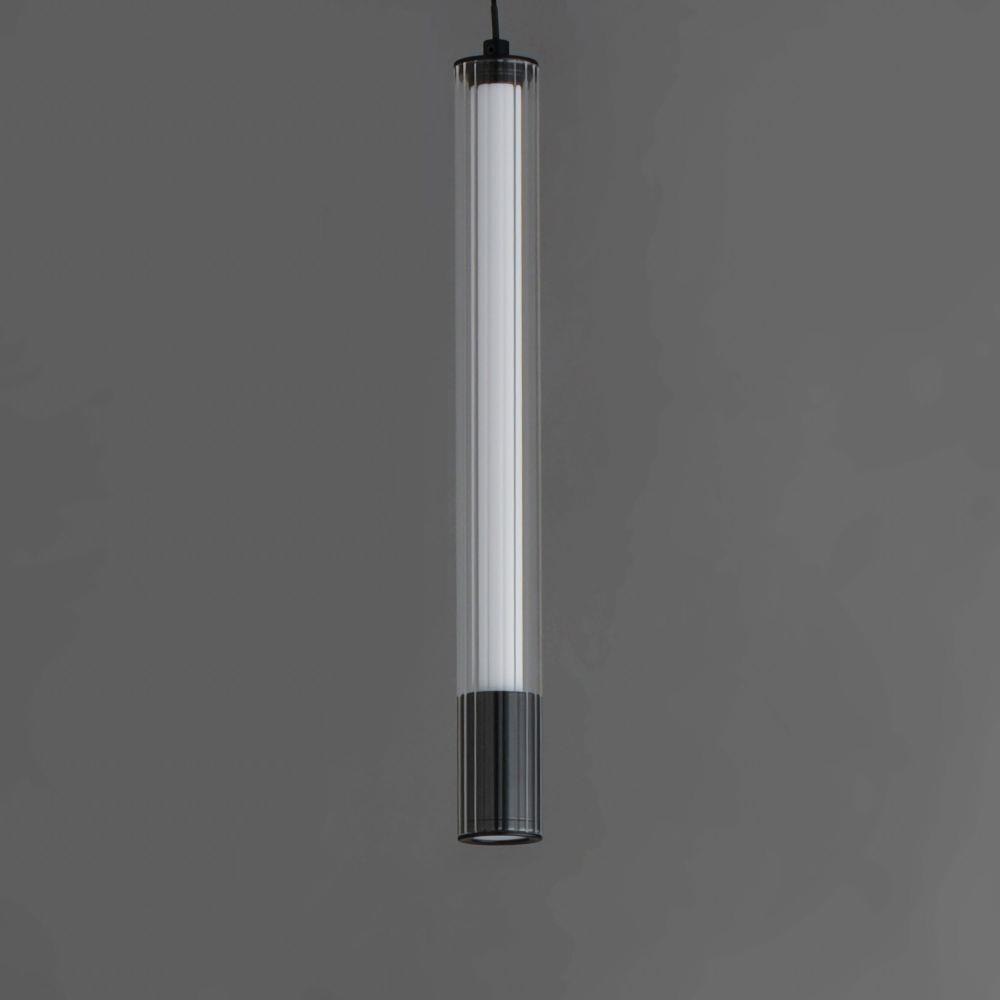 A central, cylinder diffuser of opal white acrylic diffuses LED lighting within a cavity of thin ribbed glass of various lengths. Both imaginative and functional, the bright pendants encase an additional down light recessed within a Naturally Aged Brass or Matte Black housing casting light downward.