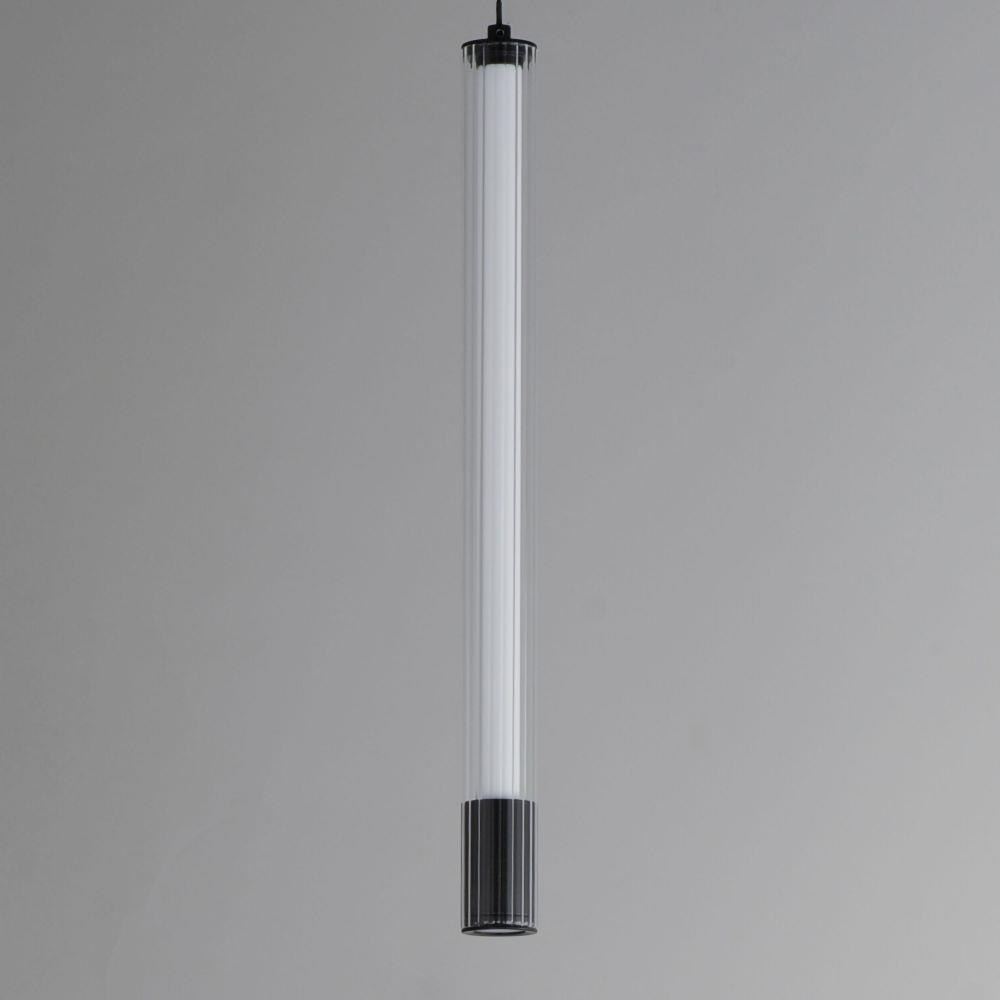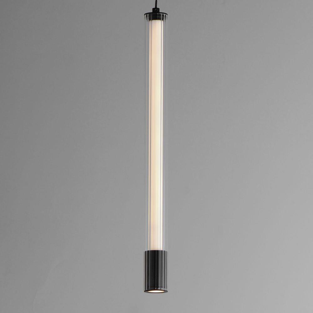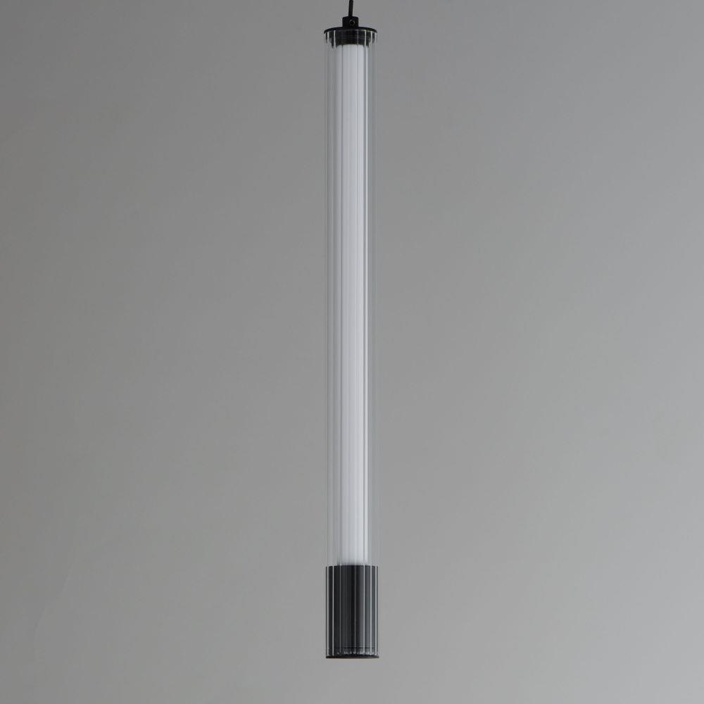 A central, cylinder diffuser of opal white acrylic diffuses LED lighting within a cavity of thin ribbed glass of various lengths. Both imaginative and functional, the bright pendants encase an additional down light recessed within a Naturally Aged Brass or Matte Black housing casting light downward.