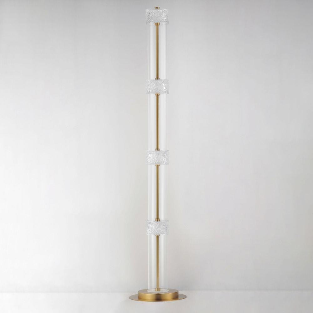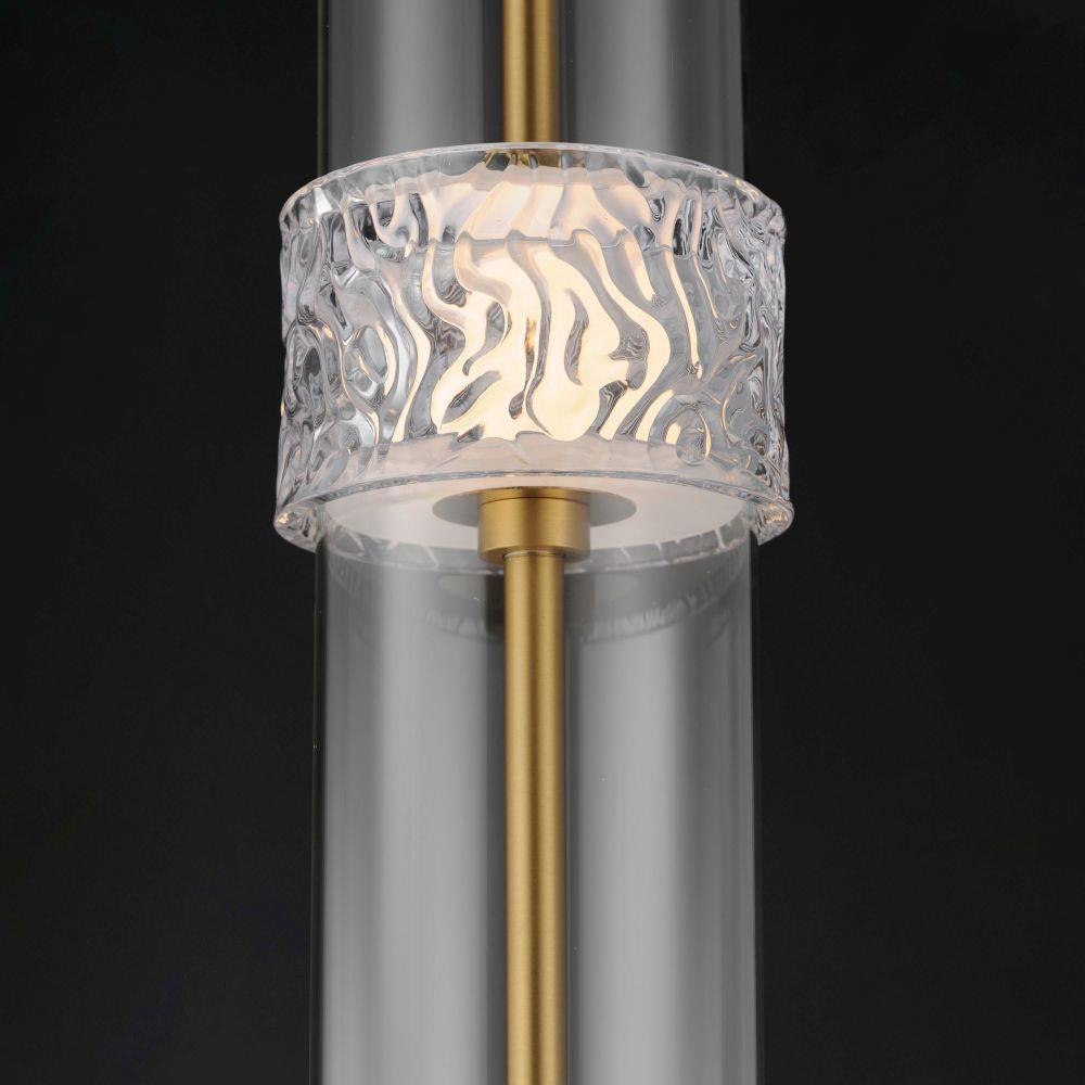 Segments of Clear glass cylinders are separated by distinctly rippled Clear crystal fonts on a thin Natural Aged Brass frame. The translucent segments are backlit with integrated LED illumination creating an airy, ethereal composition of glass textures. Available in vertical and horizontal configurations as well as sconce and portable configurations.