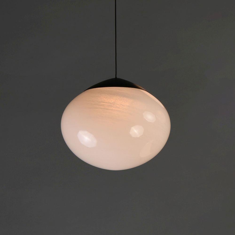 Oblong glass globe shades feature a intriguing Marble swirl pattern that obscures the integrated LED lighting within. Thin black electrical cords are easily adjustable. A larger oval 8-Light configuration features multiple sizes of the glass to create an interpretative congregation of clouds. Also available as a 3-Light, 5-Light and single pendant.