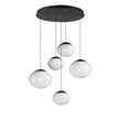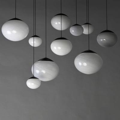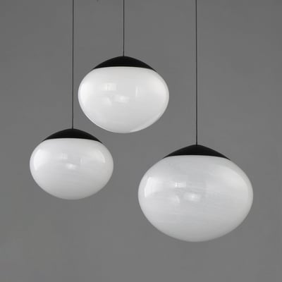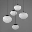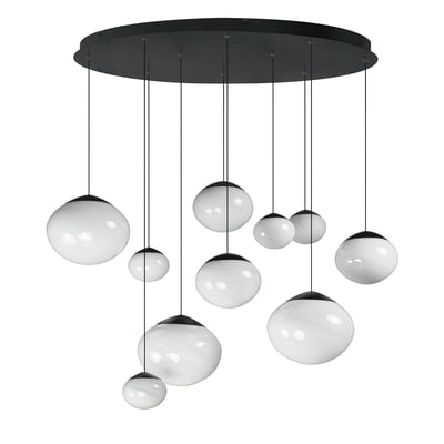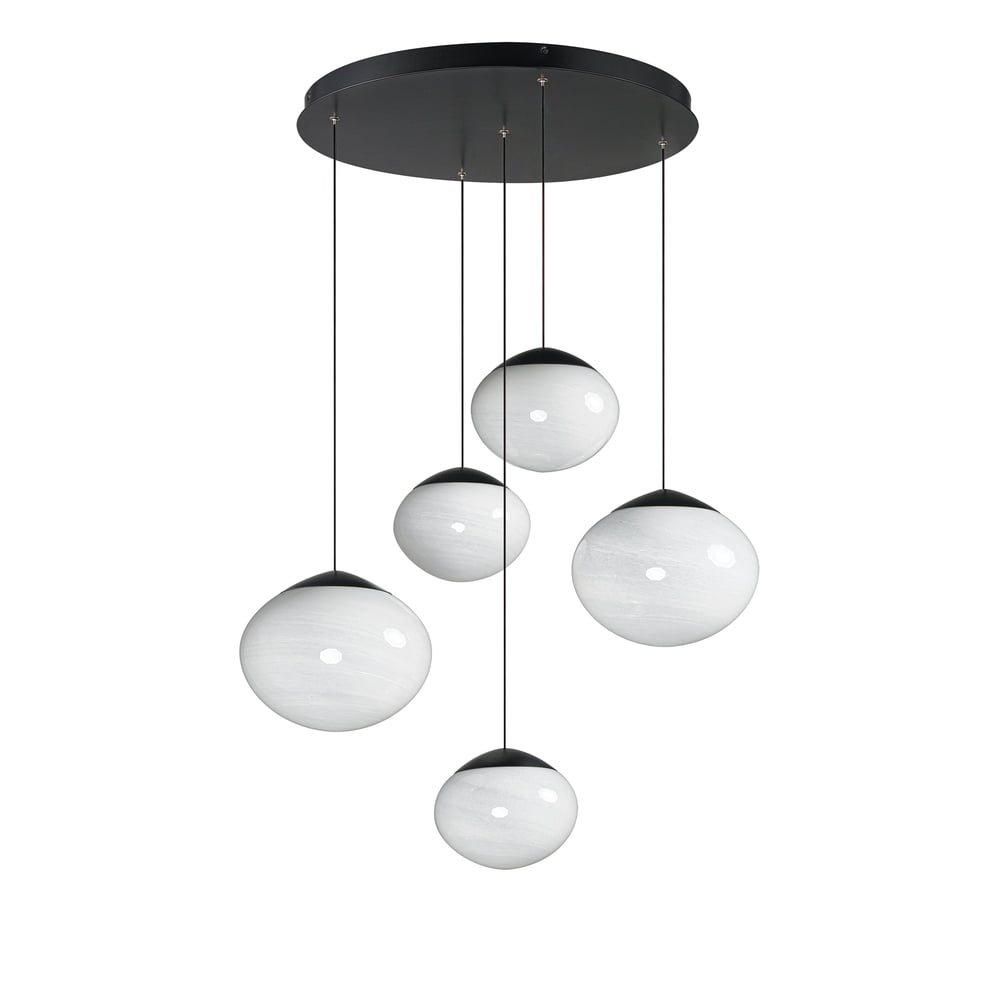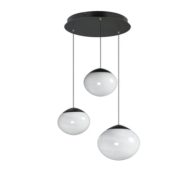 The Nimbus Multi-Light Pendant elevates modern lighting with its captivating oblong glass globe shades featuring a unique marble swirl pattern that subtly diffuses integrated LED light. Adjustable black electrical cords allow for versatile hanging options, making it a striking centerpiece for any room.