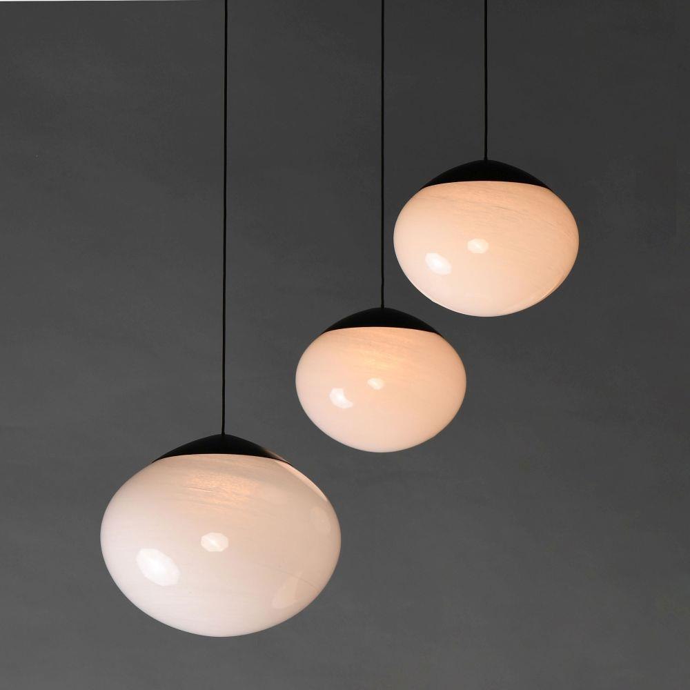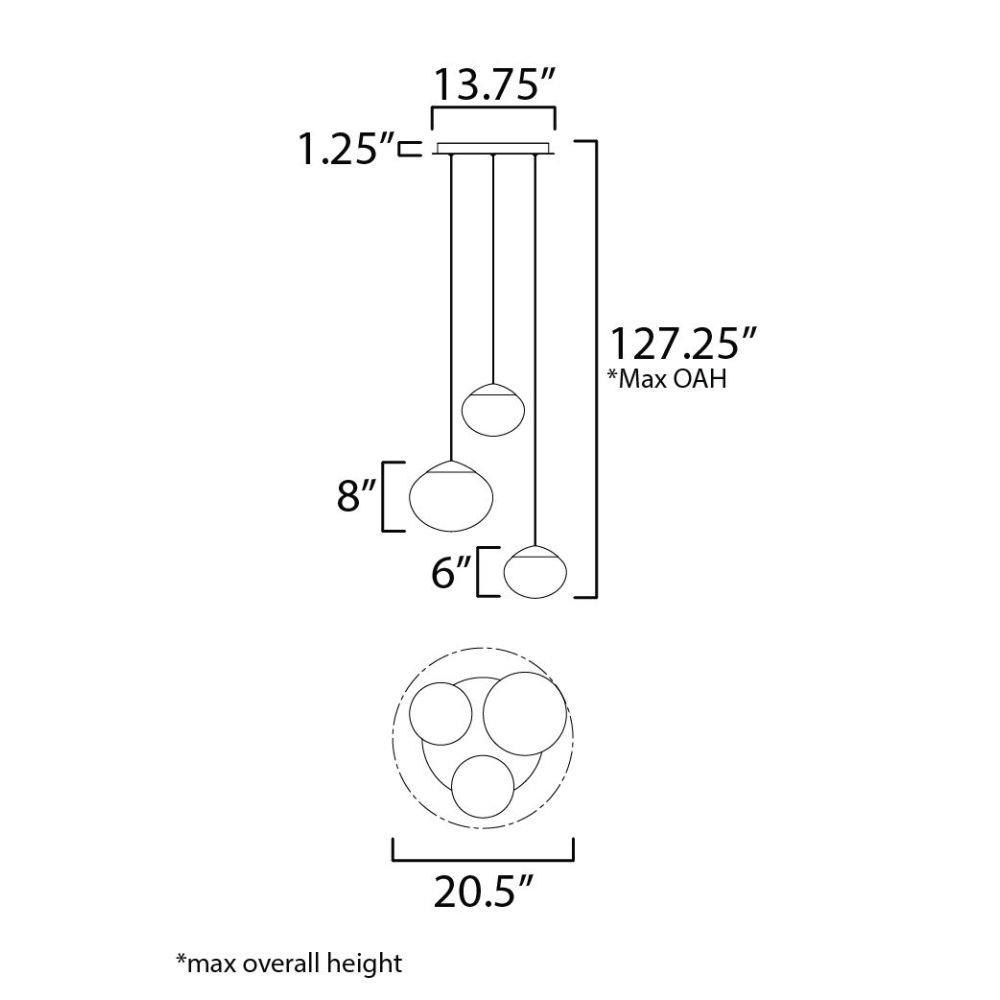 Oblong glass globe shades feature a intriguing Marble swirl pattern that obscures the integrated LED lighting within. Thin black electrical cords are easily adjustable. A larger oval 8-Light configuration features multiple sizes of the glass to create an interpretative congregation of clouds. Also available as a 3-Light, 5-Light and single pendant.