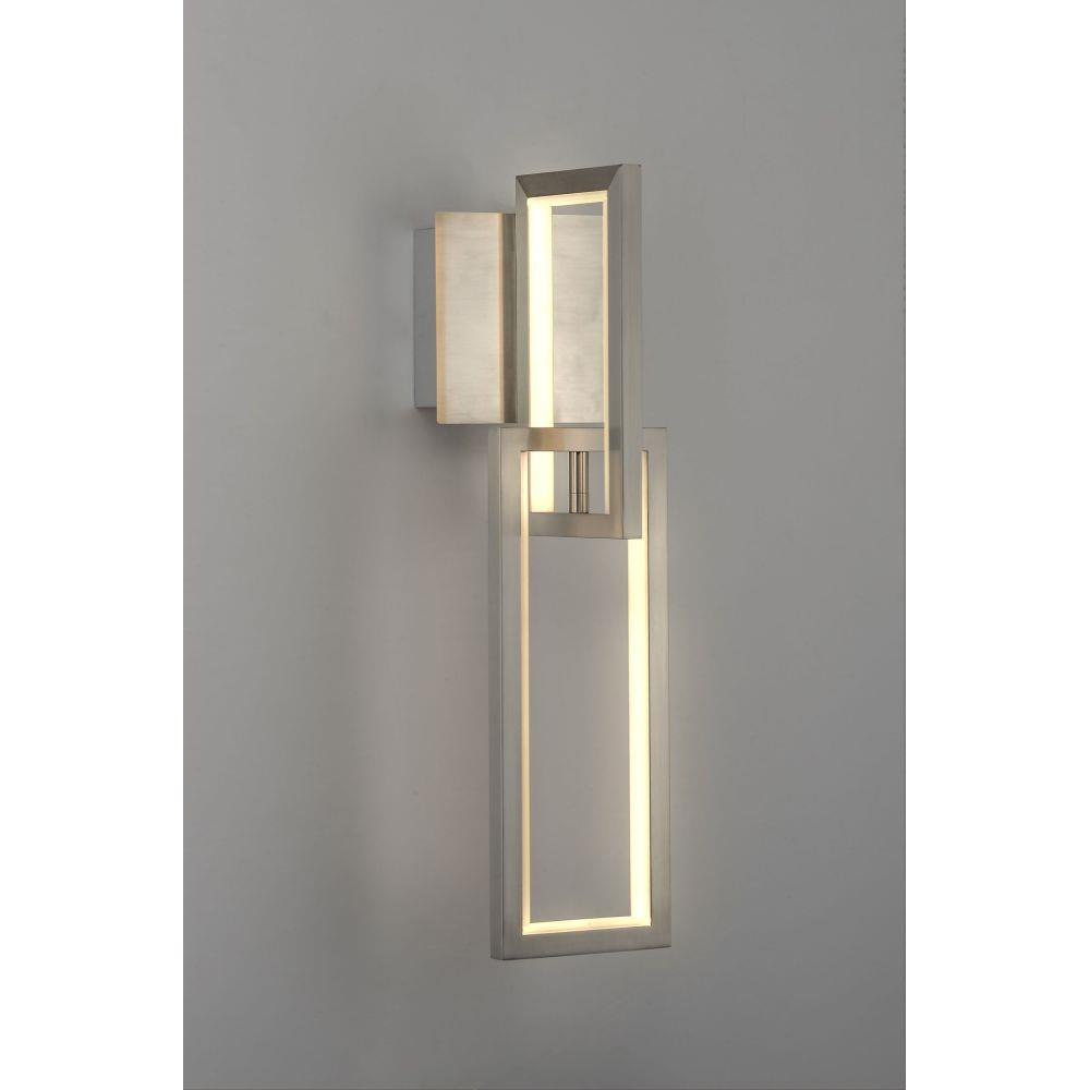 Chain links of Satin Nickel are illuminated internally by encased LED light. The suspending frames are adjustable to create different expansions of the linear pendants and flush mounts. A coordinating wall sconce completes this streamlined contemporary collection.