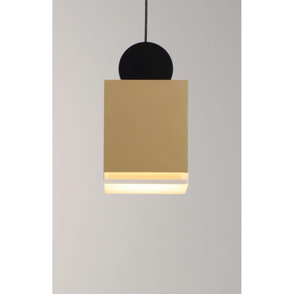 These geometric pendants can be arranged at various heights to create both a sculptural and functional form. Housings of plated Gold in various shapes and sizes are topped with a round handle of Black and finished on the bottom with a Clear acrylic diffuser.