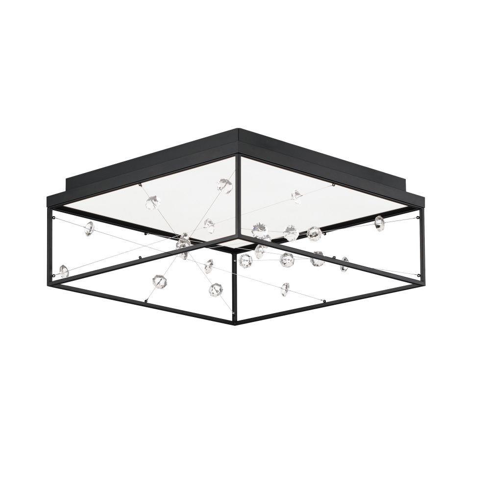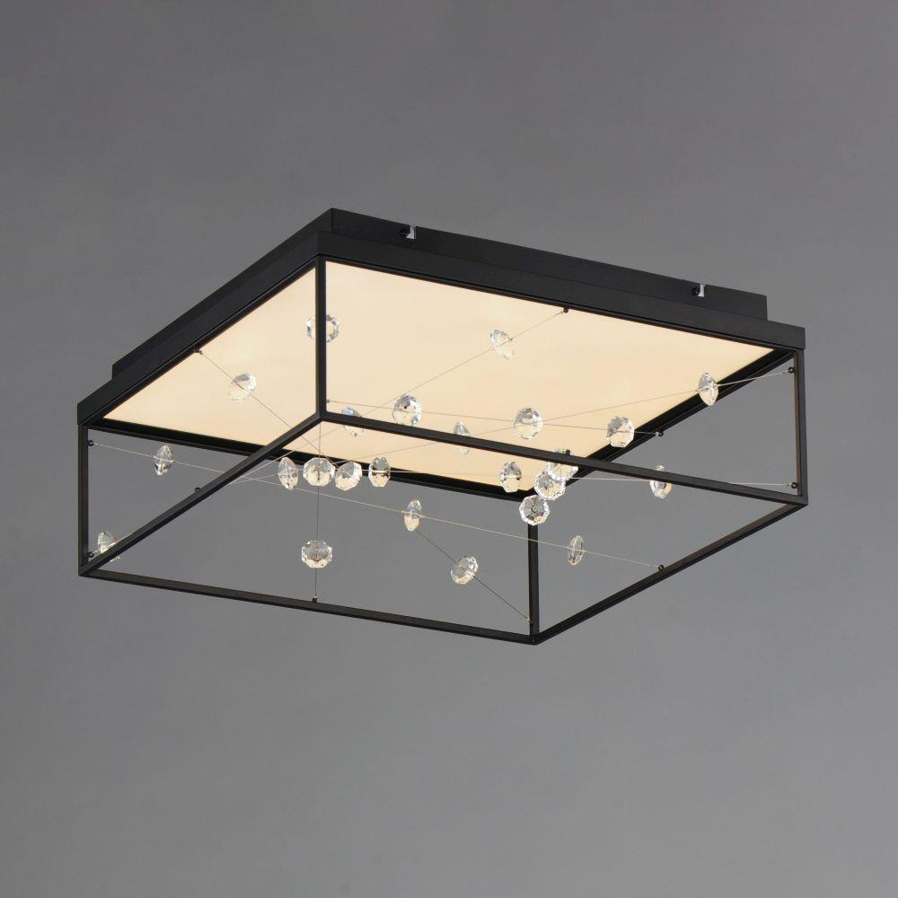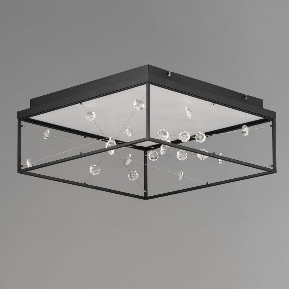 A network of wire and crystal are suspended within a box frame illuminated from above. The light panel above highlights the iridescence of the crystal while providing ample illumination to the space below.