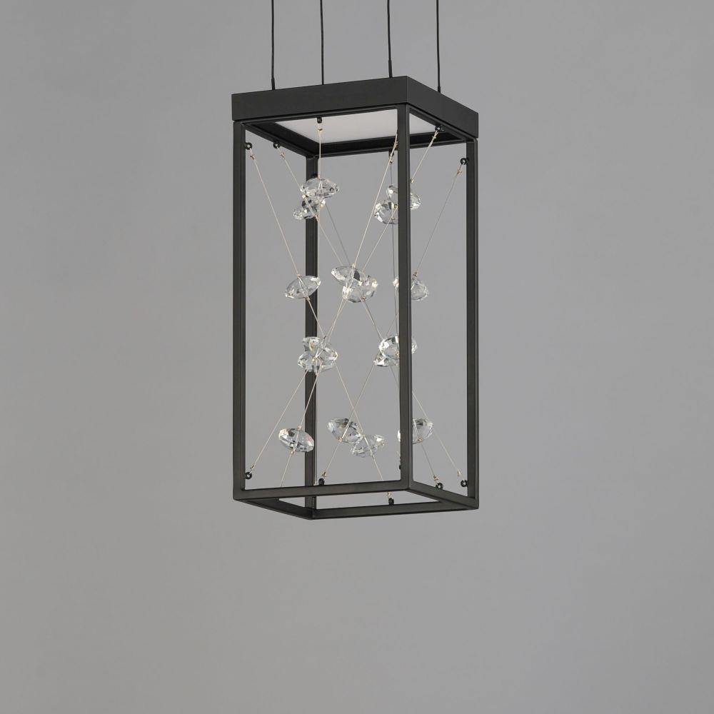 A network of wire and crystal are suspended within a box frame illuminated from above. The light panel above highlights the iridescence of the crystal while providing ample illumination to the space below.