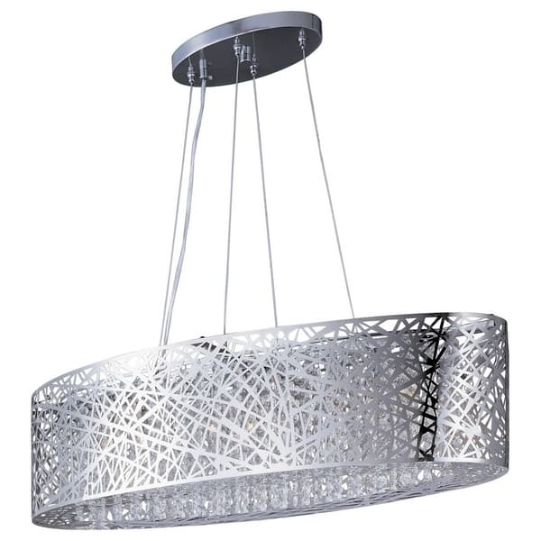 The pendant's polished chrome construction sets off the beautiful glow of this unique lamp while making it stronger than its delicate appearance implies. The 130 inches of wire used in its construction ensure this oval fixture is as durable and flexible as it is irresistible. A total of 9 lights make this lamp, so it's perfect for illuminating both small and large rooms.