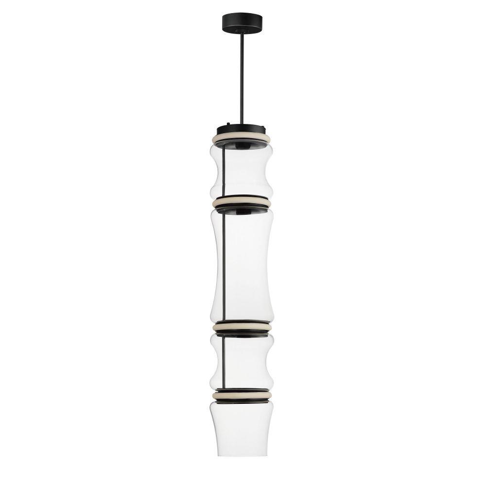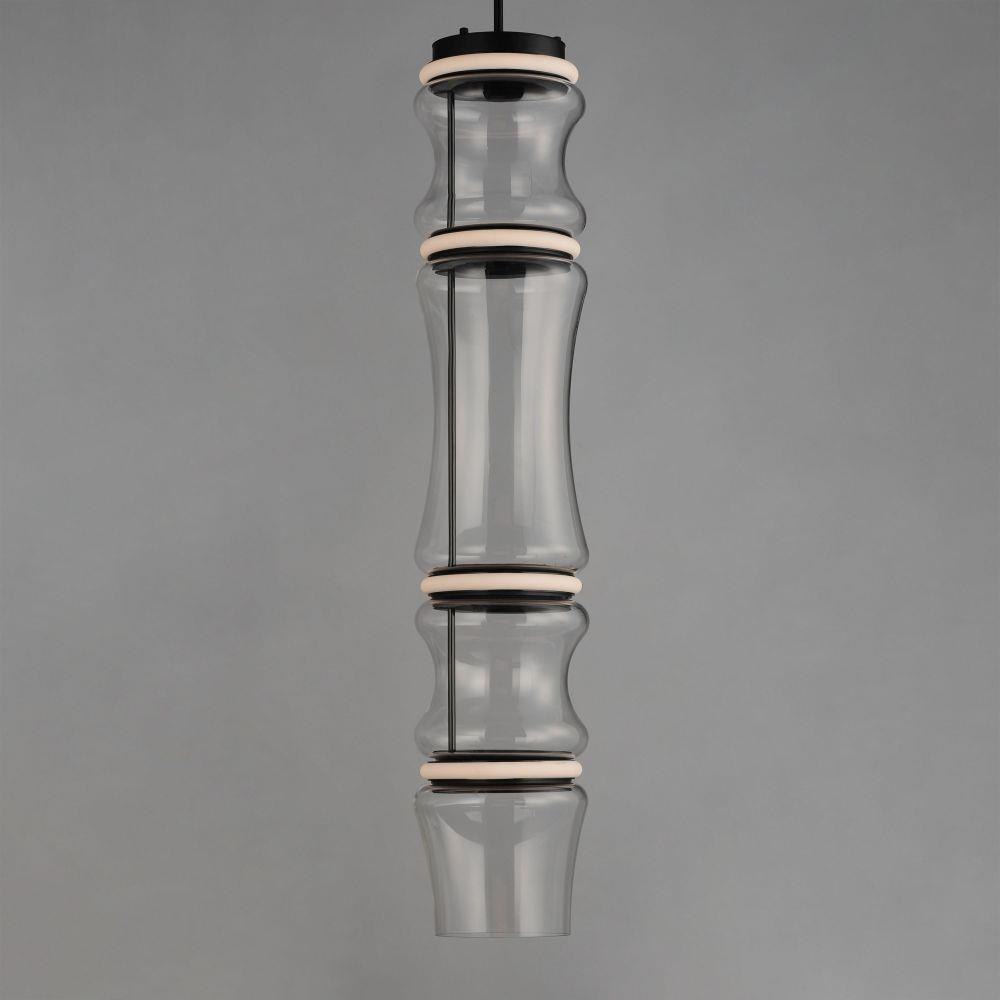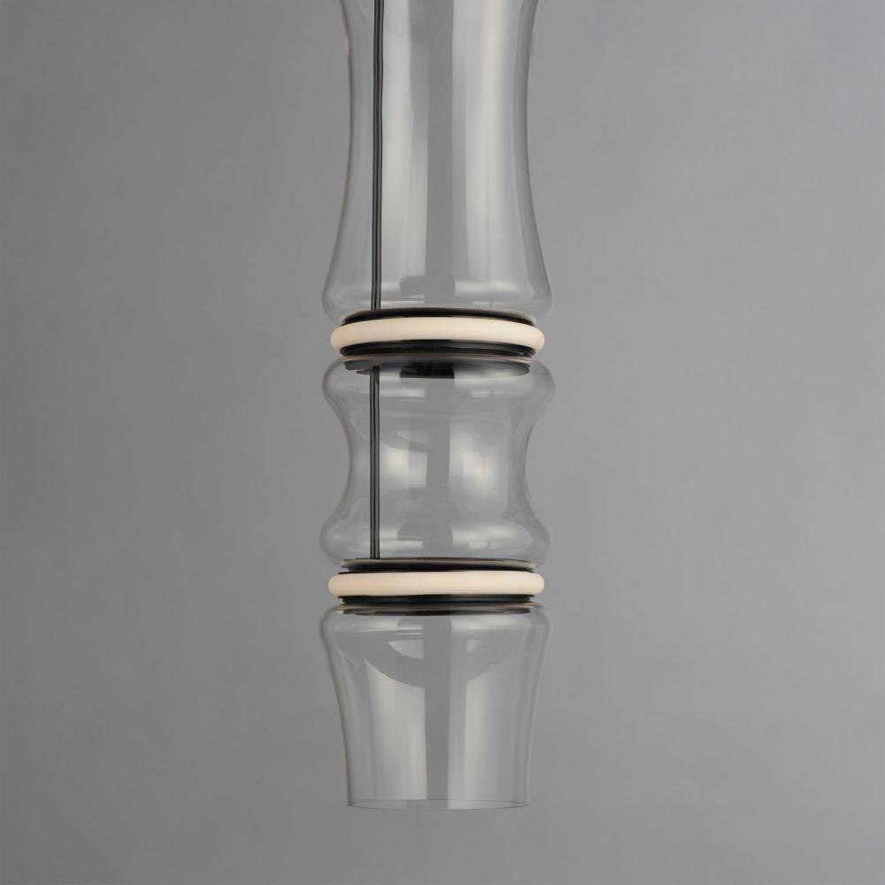 Segmented by bright LED rings finished in Matte Black, glass shades of an hourglass shape are combined into various configurations. The hand-blown glass is entirely transparent and varies in size creating an undulating pattern. All together, the series includes pendants, flush mounts, and portable lamps.