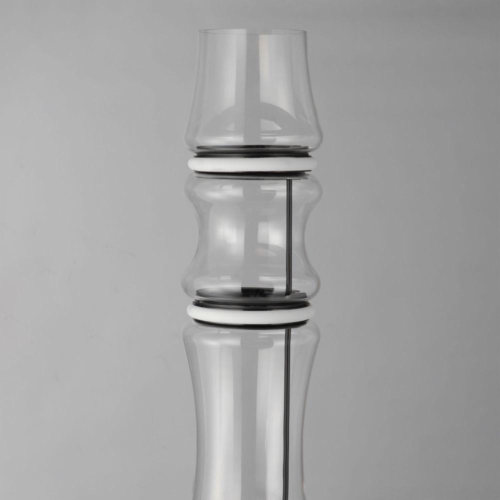 Segmented by bright LED rings finished in Matte Black, glass shades of an hourglass shape are combined into various configurations. The hand-blown glass is entirely transparent and varies in size creating an undulating pattern. All together, the series includes pendants, flush mounts, and portable lamps.