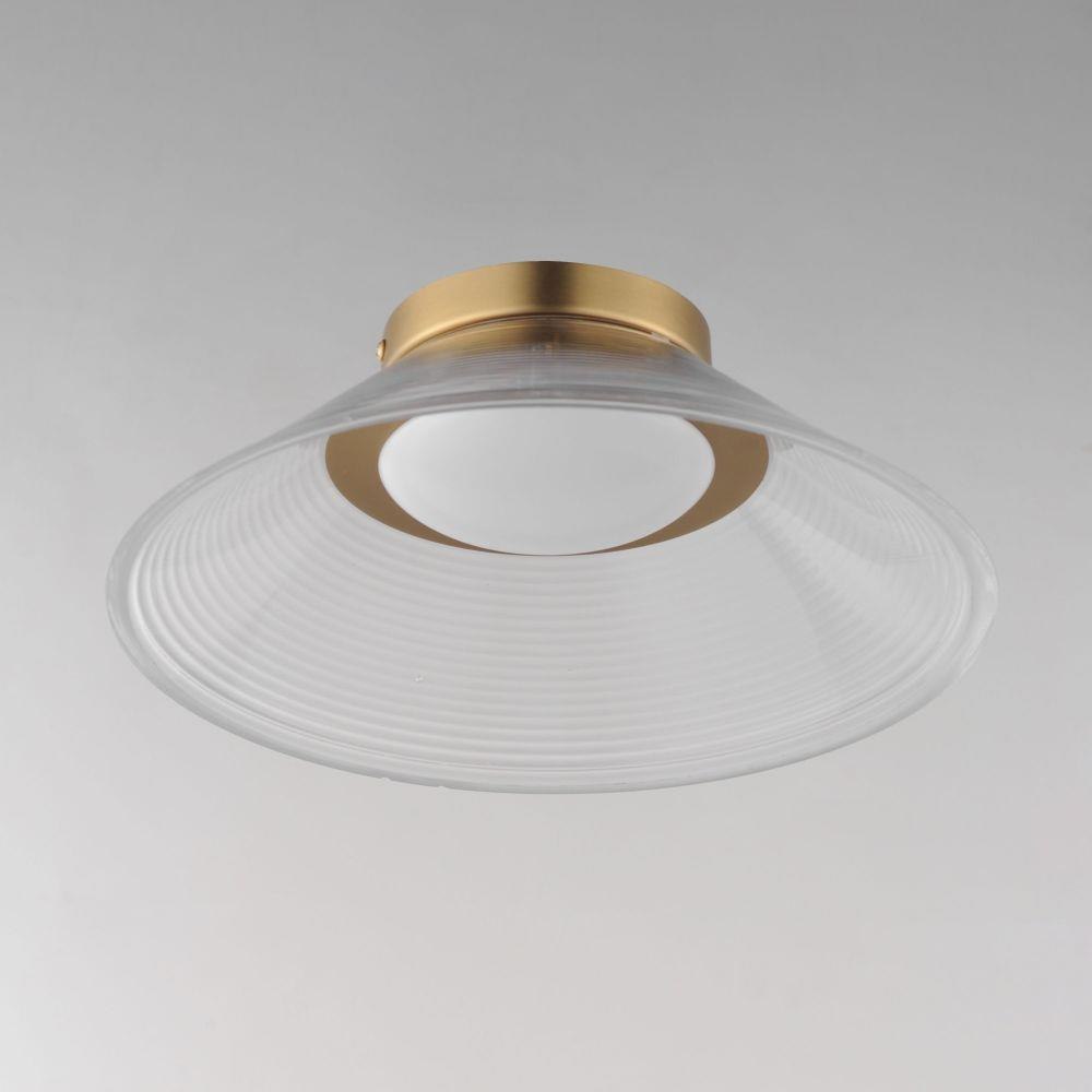 A tapered, ribbed glass shade adds a contemporary edge to a simple design. Available in Clear Ribbed glass with a plated Gold frame or in Emerald Green or Smoked glass with Matte Black frames. These retro-futuristic shades minimize peripheral glare, while a Matte White acrylic shallow domed diffuser softly disperses LED lighting, delivering ample illumination. The collection includes versatile pendant and flush mount options, with the latter doubling as a wall sconce.