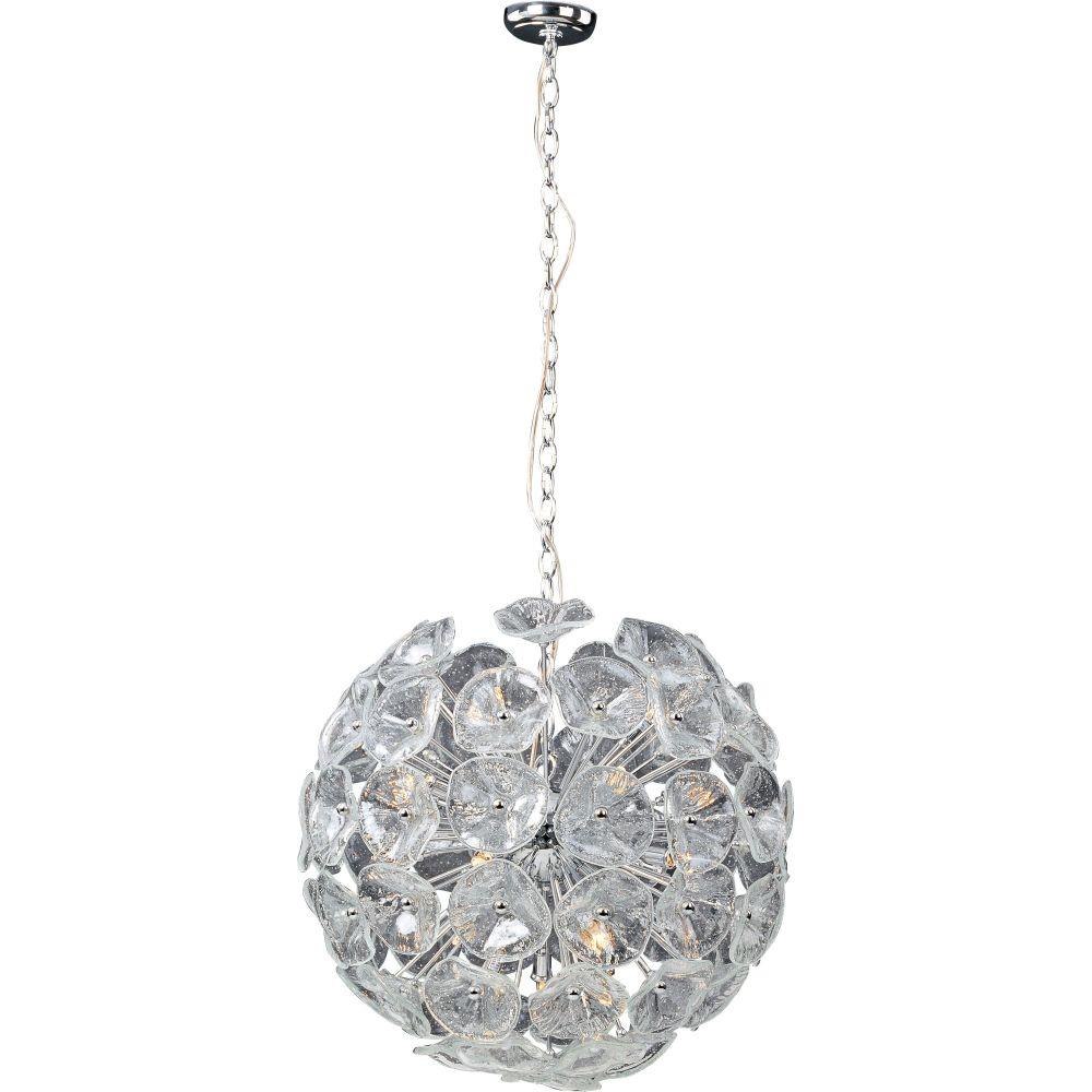 Like an illuminated hydrangea suspended in space, the Lalique Collection breaks the mold of traditional lighting. The contemporary design calls upon experienced, quality craftsmanship to create this amazing ball of light, glass, and chrome. Hand-formed, clear Murano glass petals mounted on individual arms and attached to simple spherical finials create the floral orb. The Xenon bulb glows from the heart creating a play of light and shadow on each individual petal. More than a mere lighting solution, Lalique promises to become a signature accent in your home. When you really want to make a statement, this one of a kind showpiece speaks louder than words. Maxim—Lighting that reflects your life.