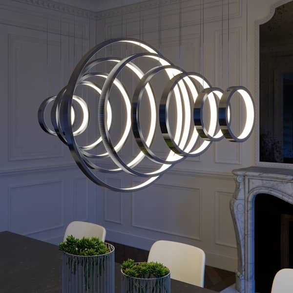 - Pendant fixture features 11 lighted hoops with strips of LED lights