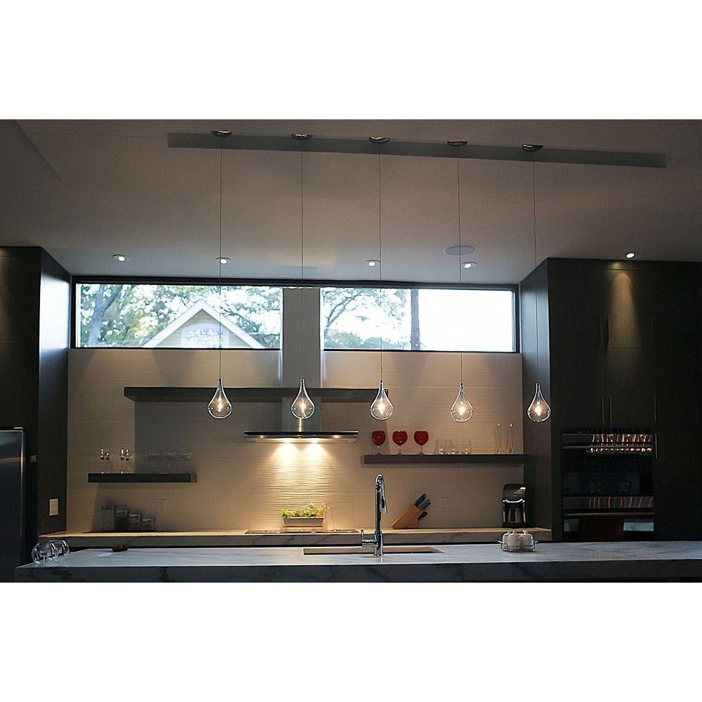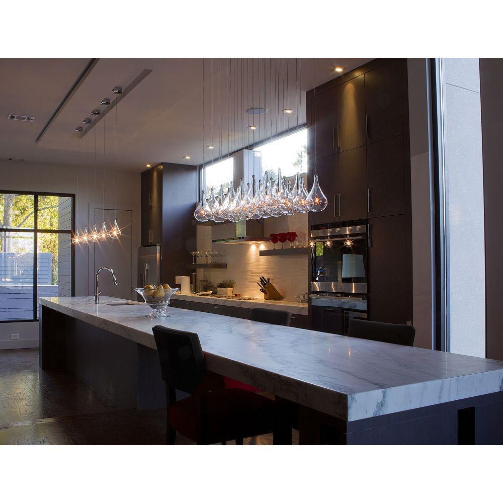 A simple idea gracefully executed in the Larmes collection. Row upon row of Clear oversized teardrops, mounted onto an extended Polished Chrome lamp holder that supports xenon lamps, sets the stage. Individually adjustable drops for custom stagger effects allow for dramatic impact. An added benefit of each drop being aircraft cable-suspended, is the ability to adjust the overall height of the piece to fit the space. The final result is stark and stunning.