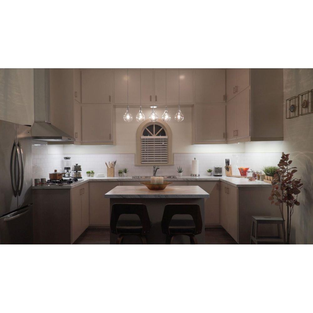 A simple idea gracefully executed in the Larmes collection. Row upon row of Clear oversized teardrops, mounted onto an extended Polished Chrome lamp holder that supports xenon lamps, sets the stage. Individually adjustable drops for custom stagger effects allow for dramatic impact. An added benefit of each drop being aircraft cable-suspended, is the ability to adjust the overall height of the piece to fit the space. The final result is stark and stunning.