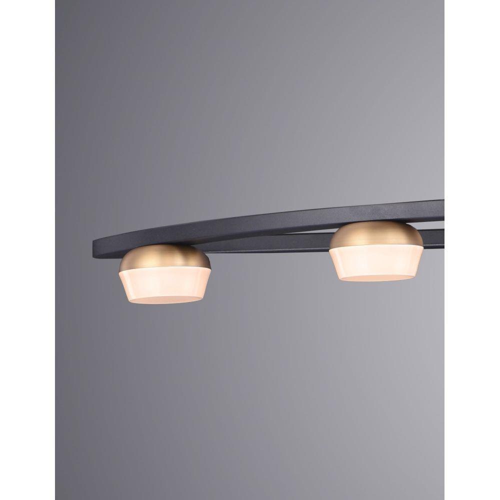 Black Frames suspend Gold painted cups with Opal White diffusers. The integrated LED offers ample light from a small aperture light source. The pendants feature offset rings to bring interest to the overall shape.