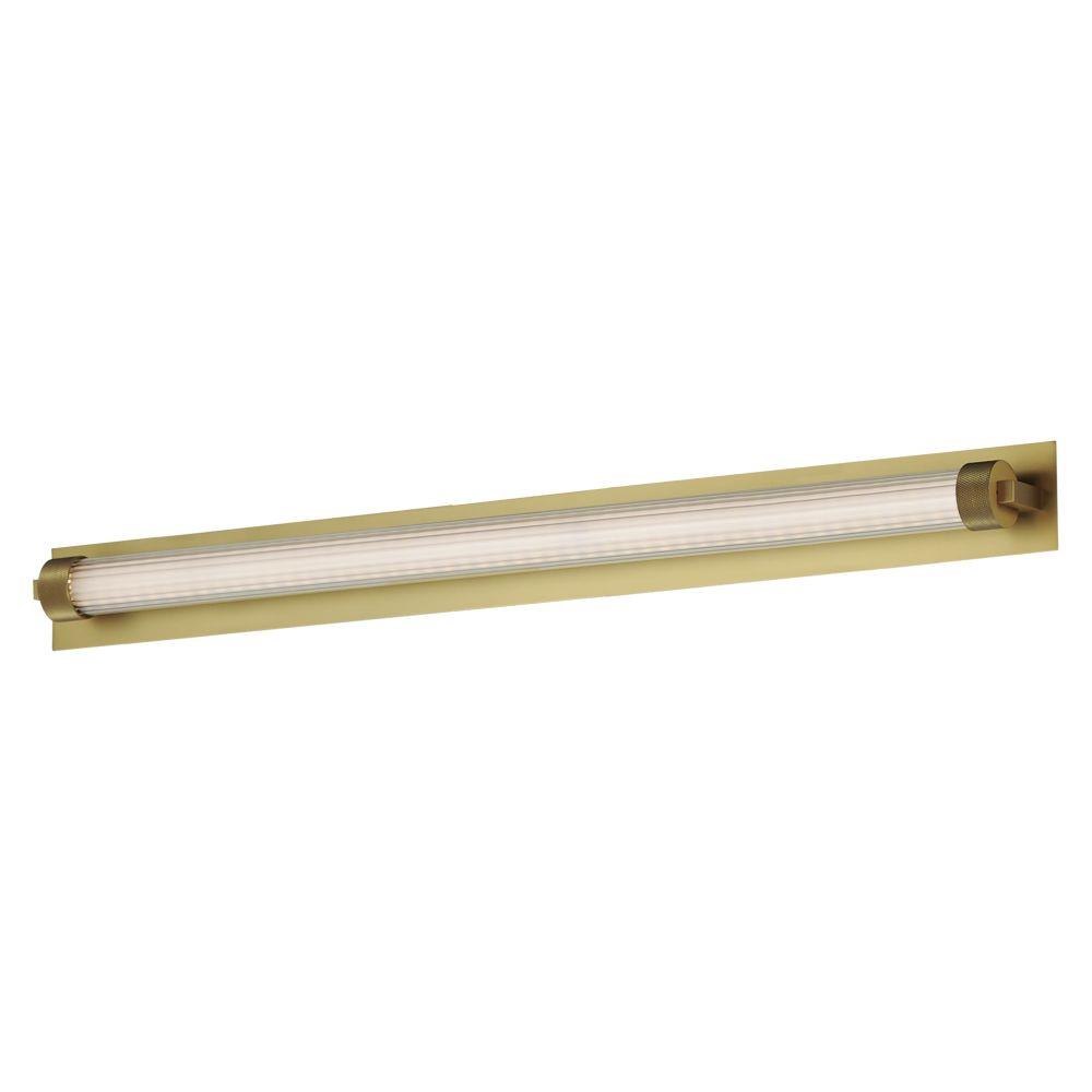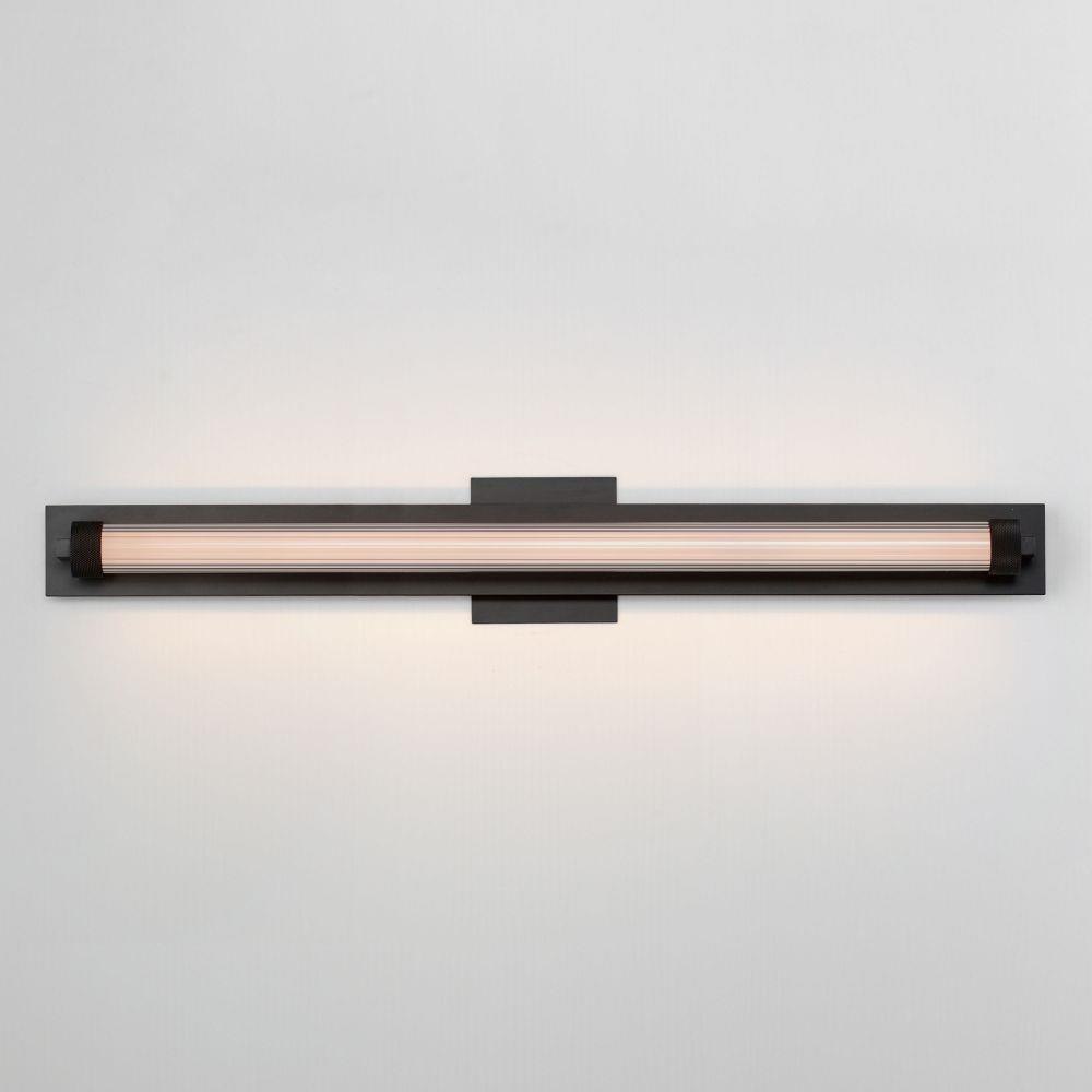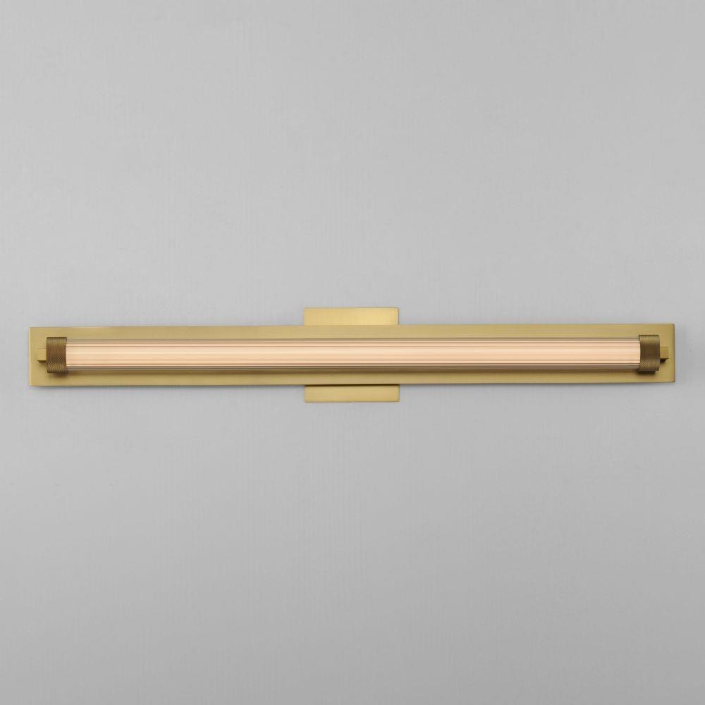 Clear ribbed glass encases a tube of opal white acrylic evenly illuminated by LED. The ends of the glass shade are fitted with knurled cylinder forms that suspend the sconces from their mounting plates. Dual mounted options are available for this series allowing it to be installed on single gang junction boxes. Available in Natural Aged Brass, Polished Chrome, or Matte Black finishes.