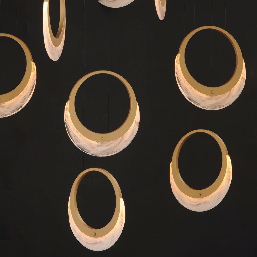Named for the Greek constellation associated with music and harmony, Lyra strikes a poetic balance between sculpture and light. Crescent-shaped cast glass, swirled in clear and white, is cradled in golden rings and suspended by slender black cables to evoke weightlessness. Rhythmic and refined, Lyra¿s composition echoes the curve of a lyre--ideal for stairwells and double-height spaces seeking a statement of modern minimalism and mythic beauty.