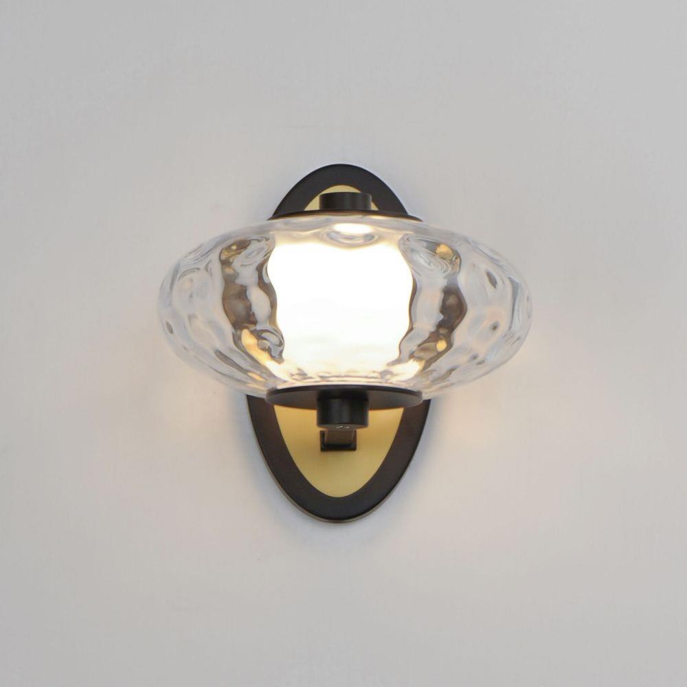 Circular bands, like ornaments, descend from thin low voltage cables in a variety of configurations. An evenly diffused LED tube spans the distance of the circular wavy glass shades creating a dazzling lighting effect. A contrasting two-tone Black and Natural Aged Brass finish supports this ornament as seen on the large LED wall sconce.