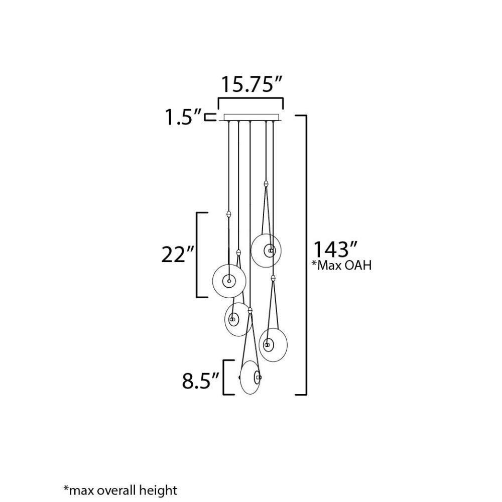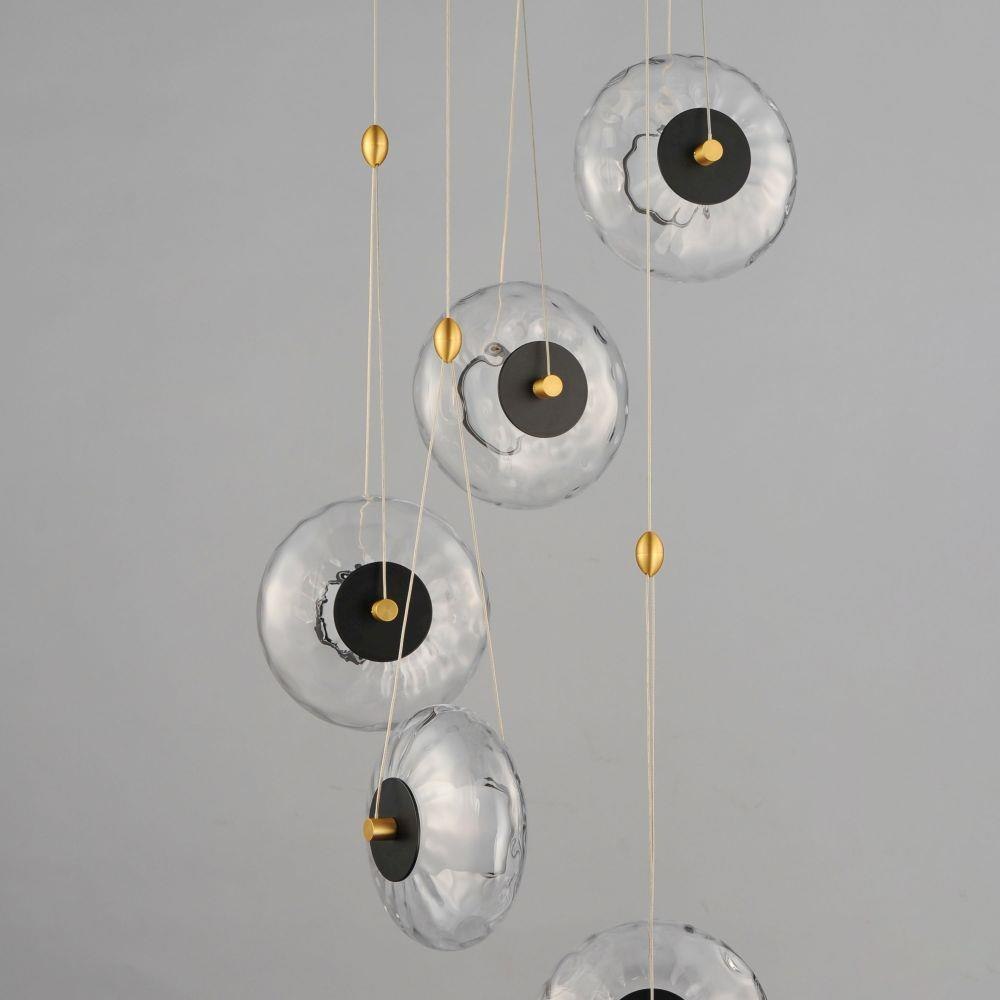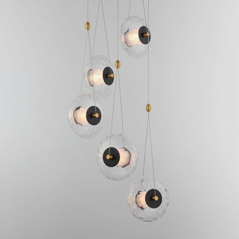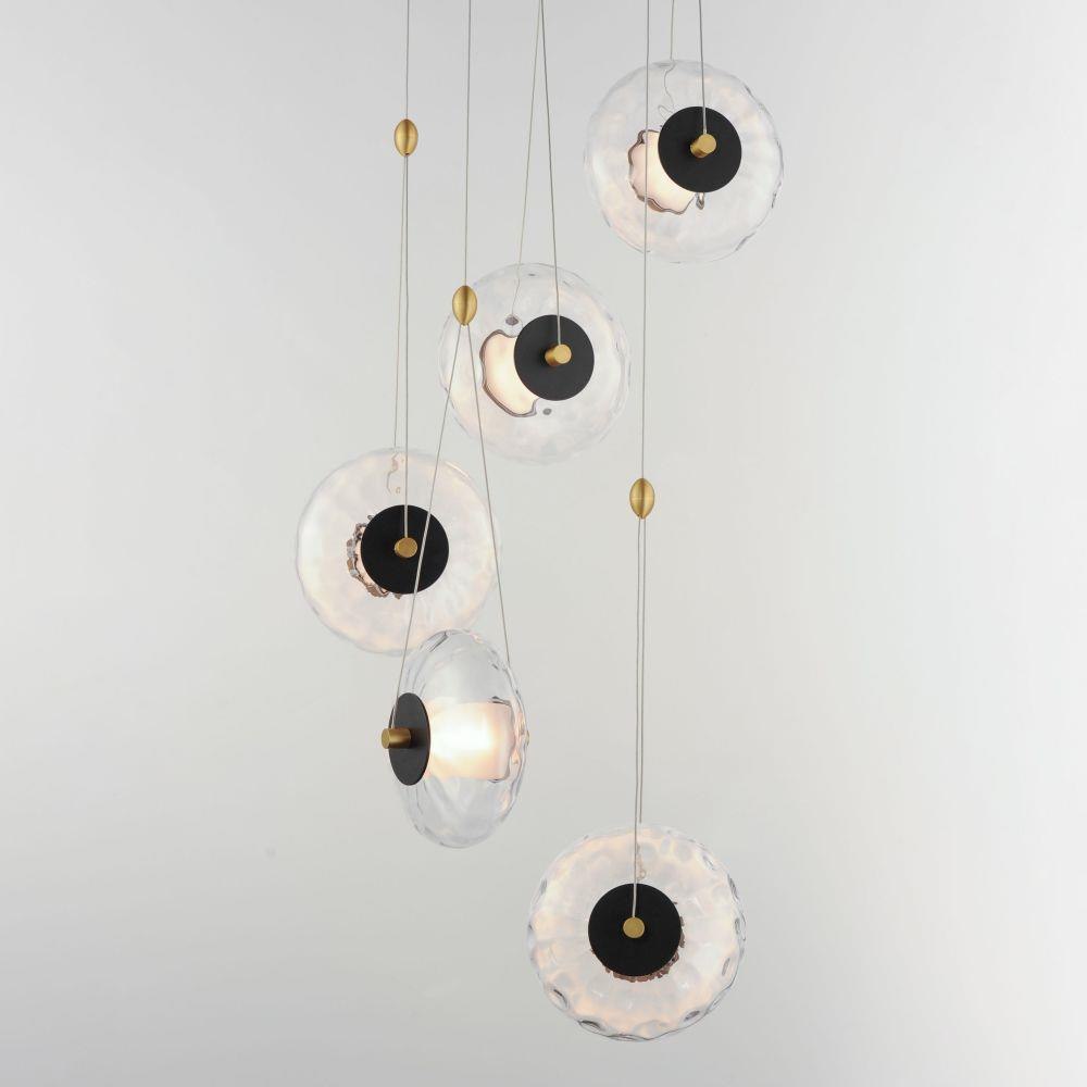 Circular bands, like ornaments, descend from thin low voltage cables in a variety of configurations. An evenly diffused LED tube spans the distance of the circular wavy glass shades creating a dazzling lighting effect. A contrasting two-tone Black and Natural Aged Brass finish supports this ornament as seen on the large LED wall sconce.